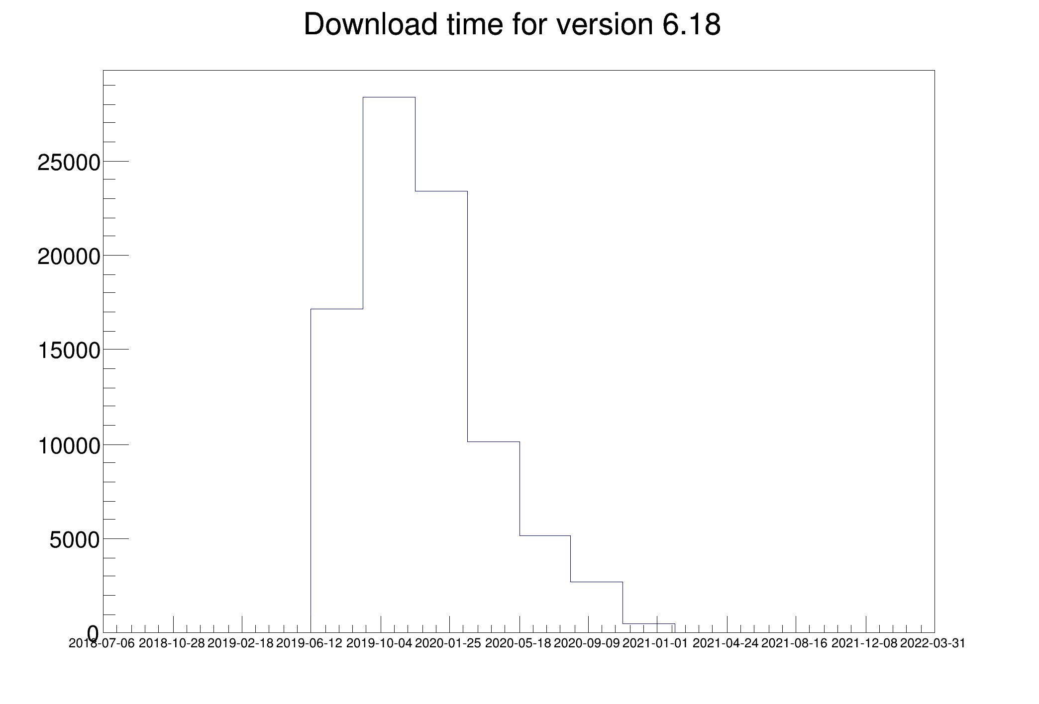.Histo1D({"h618", "Download time for version 6.18", 16, minTime, now}, {"datime"});