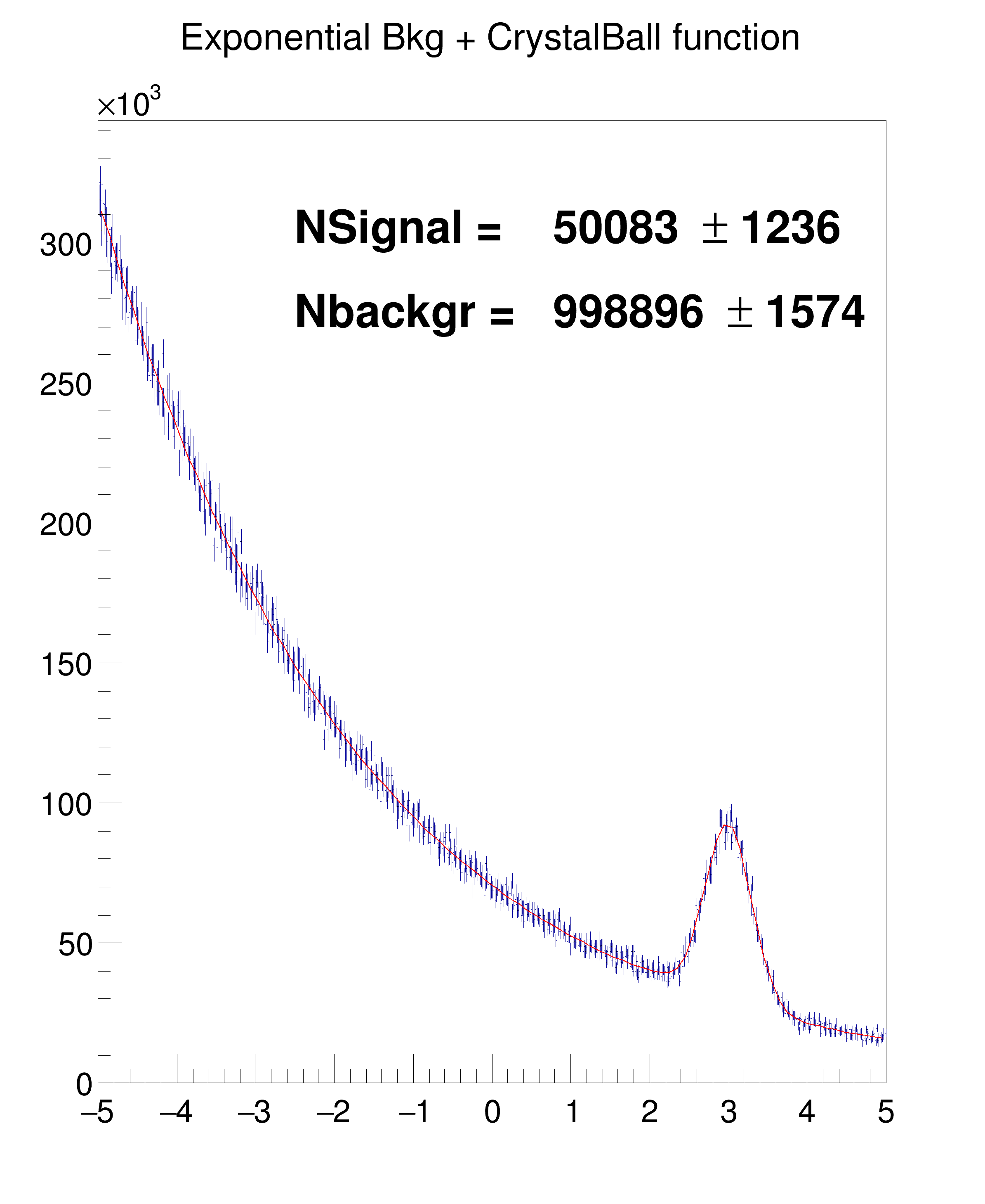 "Exponential Bkg + CrystalBall function", NBins, -5., 5.);