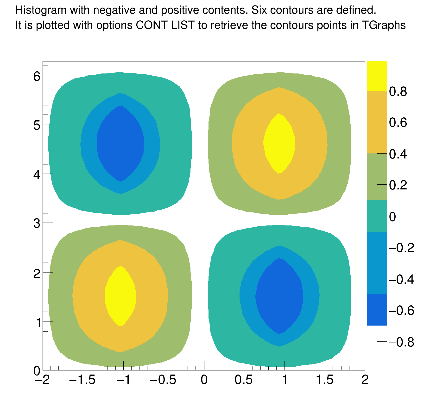 "#splitline{Histogram with negative and positive contents. Six contours are defined.}{It is plotted with options CONT LIST to retrieve the contours points in TGraphs}",
