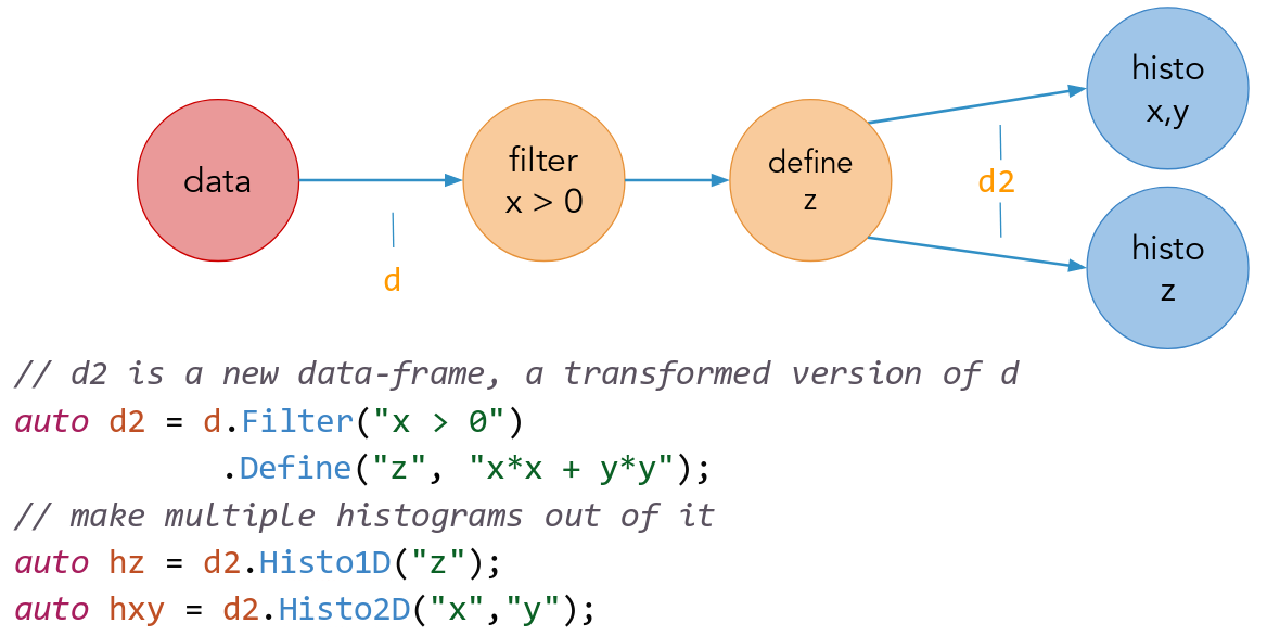 This example is slightly more advanced than what we have seen so far: for starters, it makes use of lambda captures (a simple way to make external variables available inside the body of c++ lambdas) to act on the same variable x from both Define transformations. Secondly we have stored the transformed data-frame in a variable. This is always possible: at each point of the transformation chain, users can store the status of the data-frame for further use (more on this below).