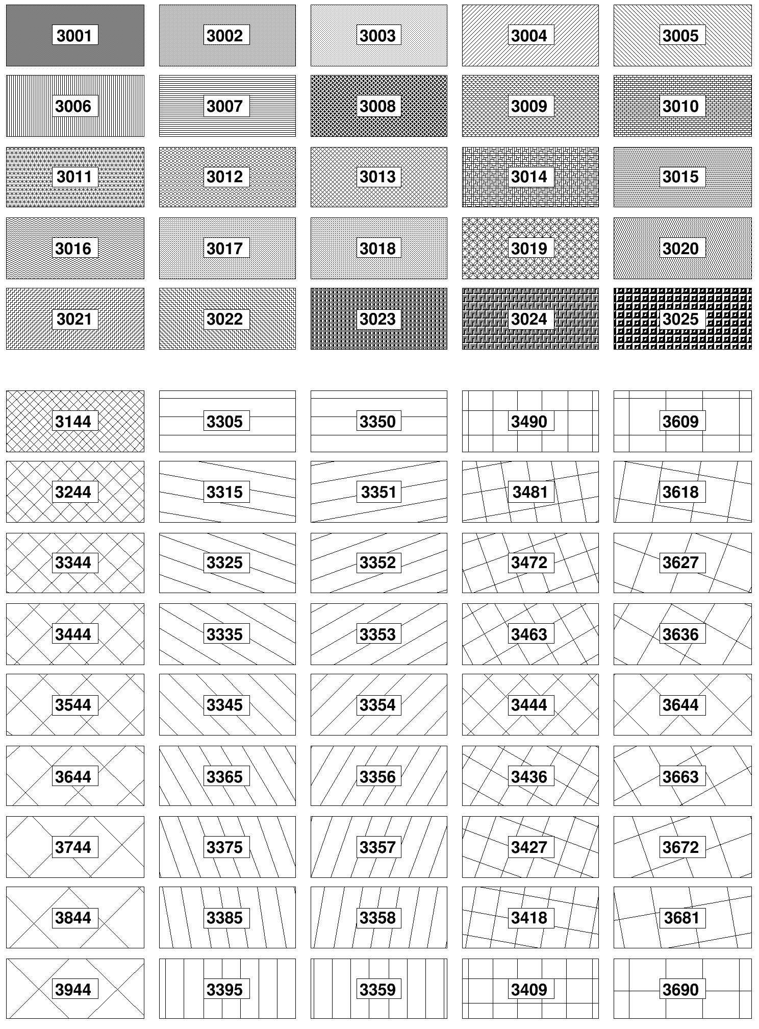 The following table shows the list of pattern styles. The first table displays the 25 fixed patterns. They cannot be customized unlike the hatches displayed in the second table which be customized using: