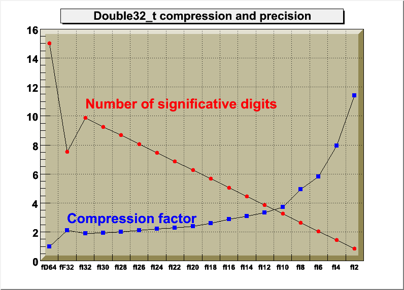 In case A fNormal is converted from a Double_t to a Float_t In case B fTemperature is converted to a 32 bit unsigned integer In case C fCharge is converted to a 2 bits unsigned integer In case D the array elements of fVertex are converted to an unsigned 10 bits integer In case E fChi2 is converted to a Float_t with mantissa truncated precision at 6 bits In case F the fNsp elements of array fPointvalue are converted to an unsigned 32 bit integer Note that the range specifier must follow the dimension specifier. Case B has more precision (9 to 10 significative digits than case A (6 to 7 digits). See TBufferFile::WriteFloat16 for more information.