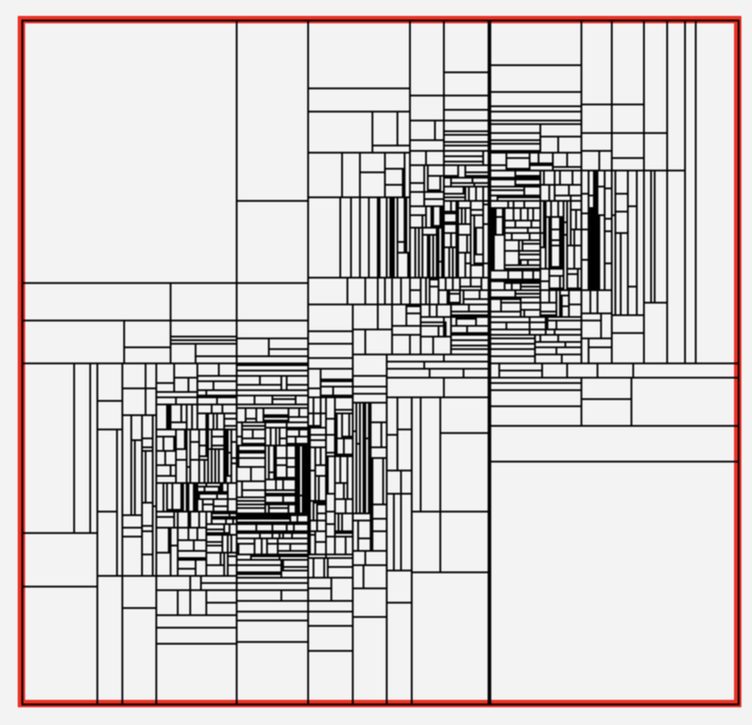 FOAM is the simplified version of the multi-dimensional general purpose Monte Carlo event generator (integrator) FOAM. It creates hyper-rectangular "foam of cells", which is more dense around its peaks. See the following 2-dim. example of the map of 1000 cells for doubly peaked distribution: