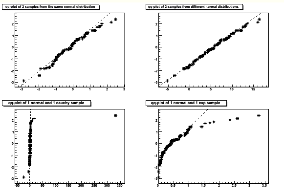 Quantile-quantile plots are used to determine whether 2 samples come from the same distribution. A qq-plot draws the quantiles of one dataset against the quantile of the the other. The quantiles of the dataset with fewer entries are on Y axis, with more entries - on X axis. A straight line, going through 0.25 and 0.75 quantiles is also plotted for reference. It represents a robust linear fit, not sensitive to the extremes of the datasets. If the datasets come from the same distribution, points of the plot should fall approximately on the 45 degrees line. If they have the same distribution function, but location or scale different parameters, they should still fall on the straight line, but not the 45 degrees one. The greater their departure from the straight line, the more evidence there is, that the datasets come from different distributions. The advantage of qq-plot is that it not only shows that the underlying distributions are different, but, unlike the analytical methods, it also gives information on the nature of this difference: heavier tails, different location/scale, different shape, etc.
