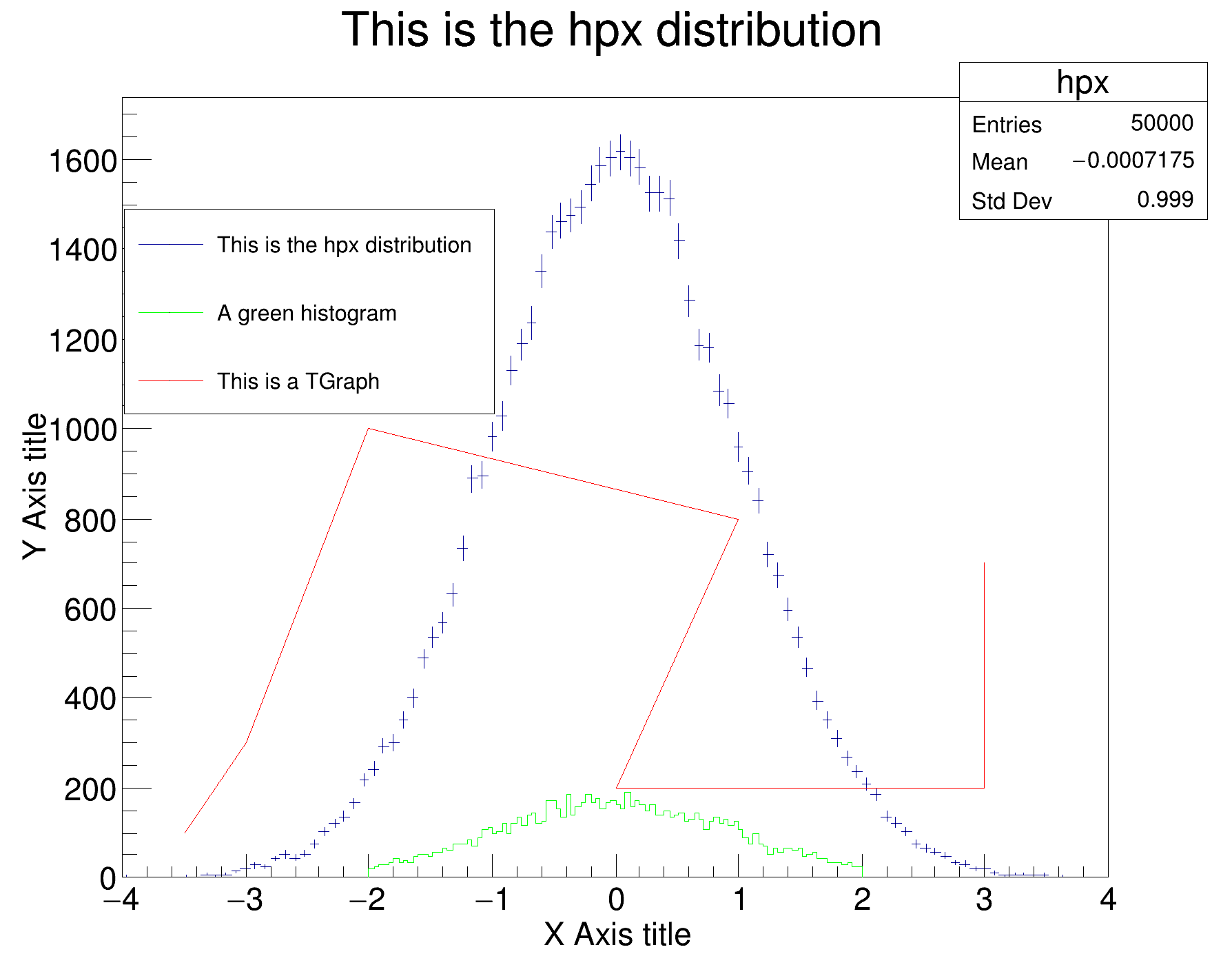 The following example shows how to create a legend. In this example the legend contains a histogram, a function and a graph. The histogram is put in the legend using its reference pointer whereas the graph and the function are added using their names. Note that, because TGraph constructors do not have the TGraph name as parameter, the graph name should be specified using the SetName method.