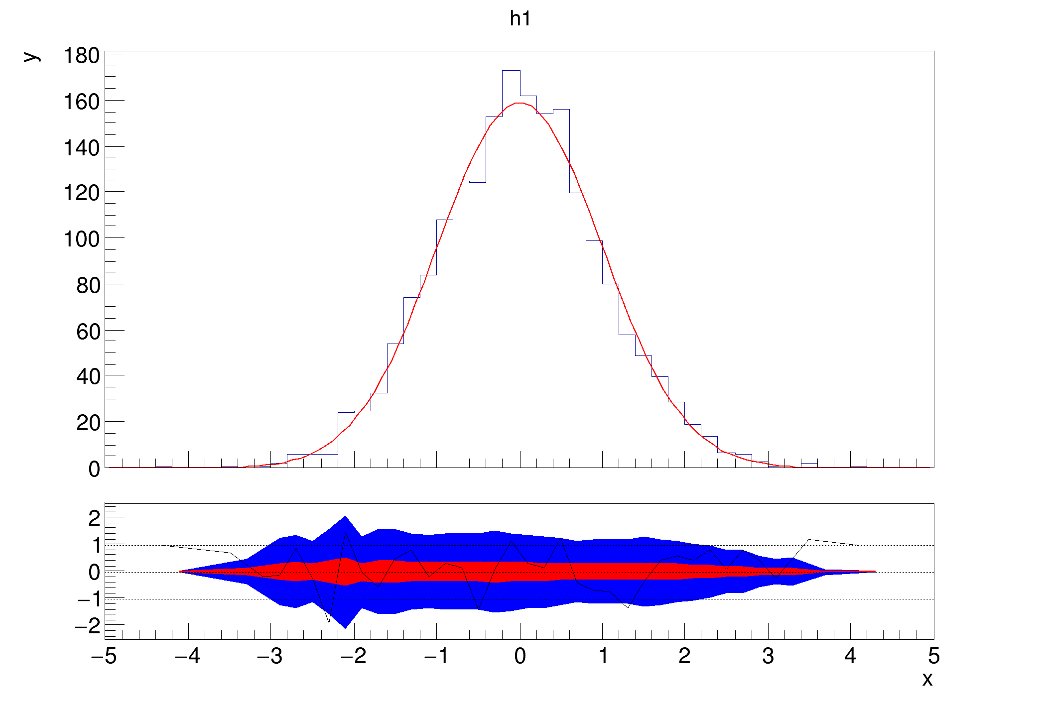 A second constructor only accepts a single histogram, but expects it to have a fitted function. The function is used to calculate the residual between the fit and the histogram. Here, it is expected that h1 has a fit function in it's list of functions. The class calculates the difference between the histogram and the fit function at each point and divides it by the uncertainty. There are a few option to steer which error is used (as is the case for diffsig). The default is to use the statistical uncertainty from h1 using TH1::GetBinError. If the option string contains errasym, asymmetric errors will be used. The type of error can be steered by TH1::SetBinErrorOption. The corresponding error will be used, depending on if the function is below or above the bin content. The third option errfunc uses the square root of the function value as the error.