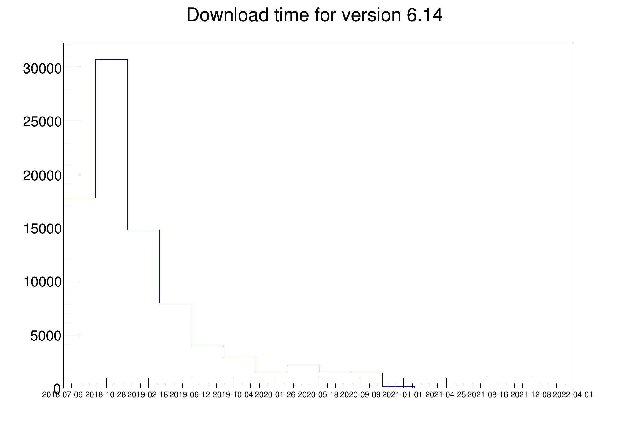 .Histo1D({"h614", "Download time for version 6.14", 16, minTime, now}, {"datime"});