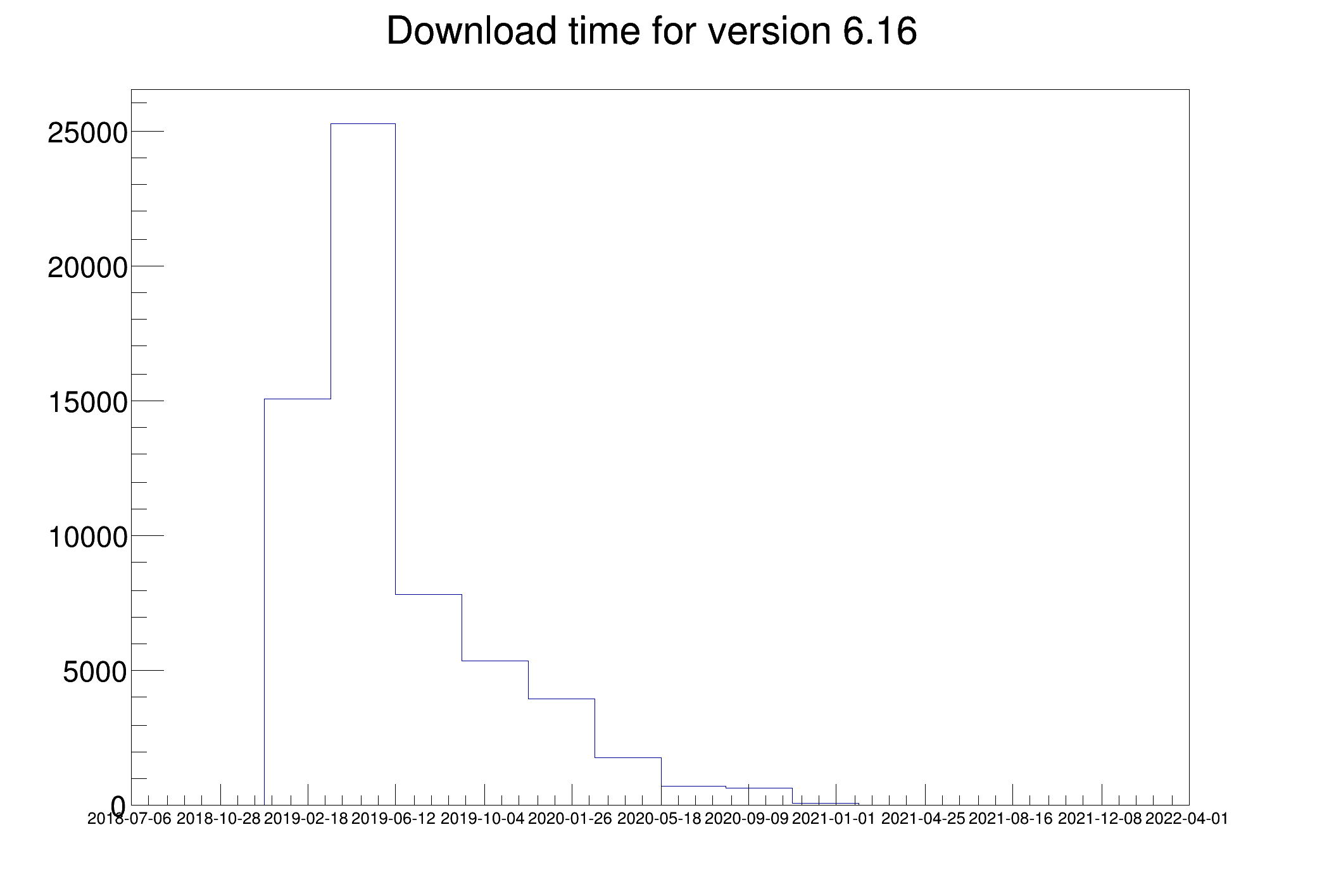 .Histo1D({"h616", "Download time for version 6.16", 16, minTime, now}, {"datime"});