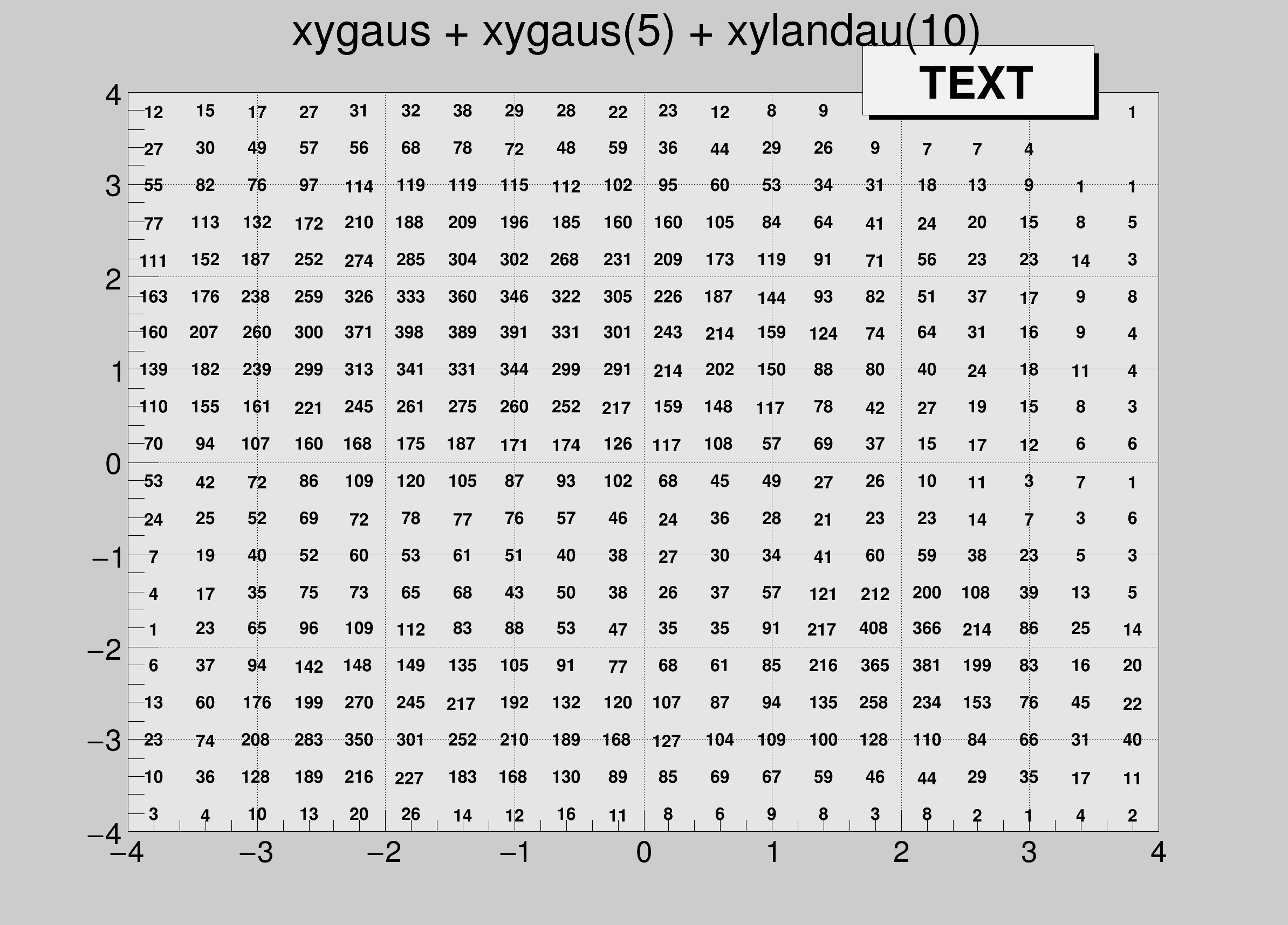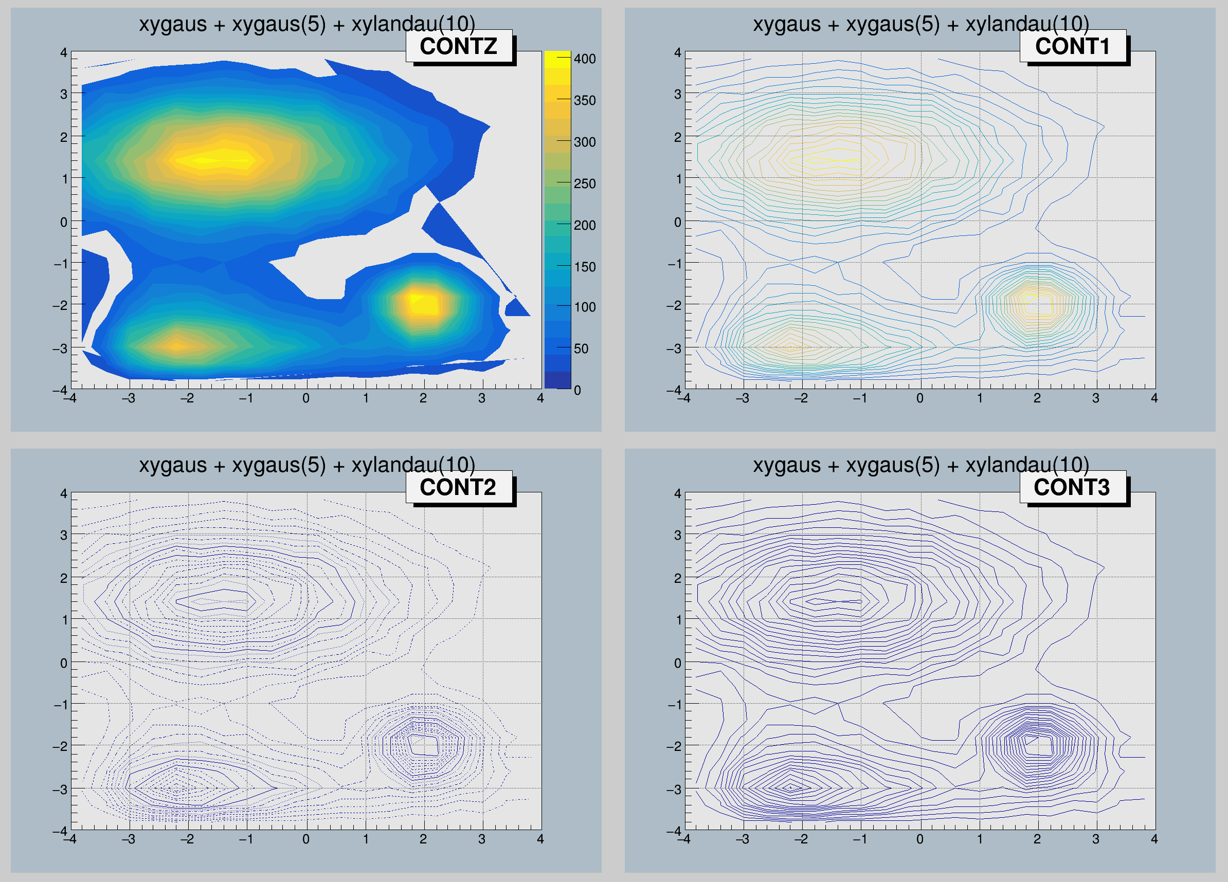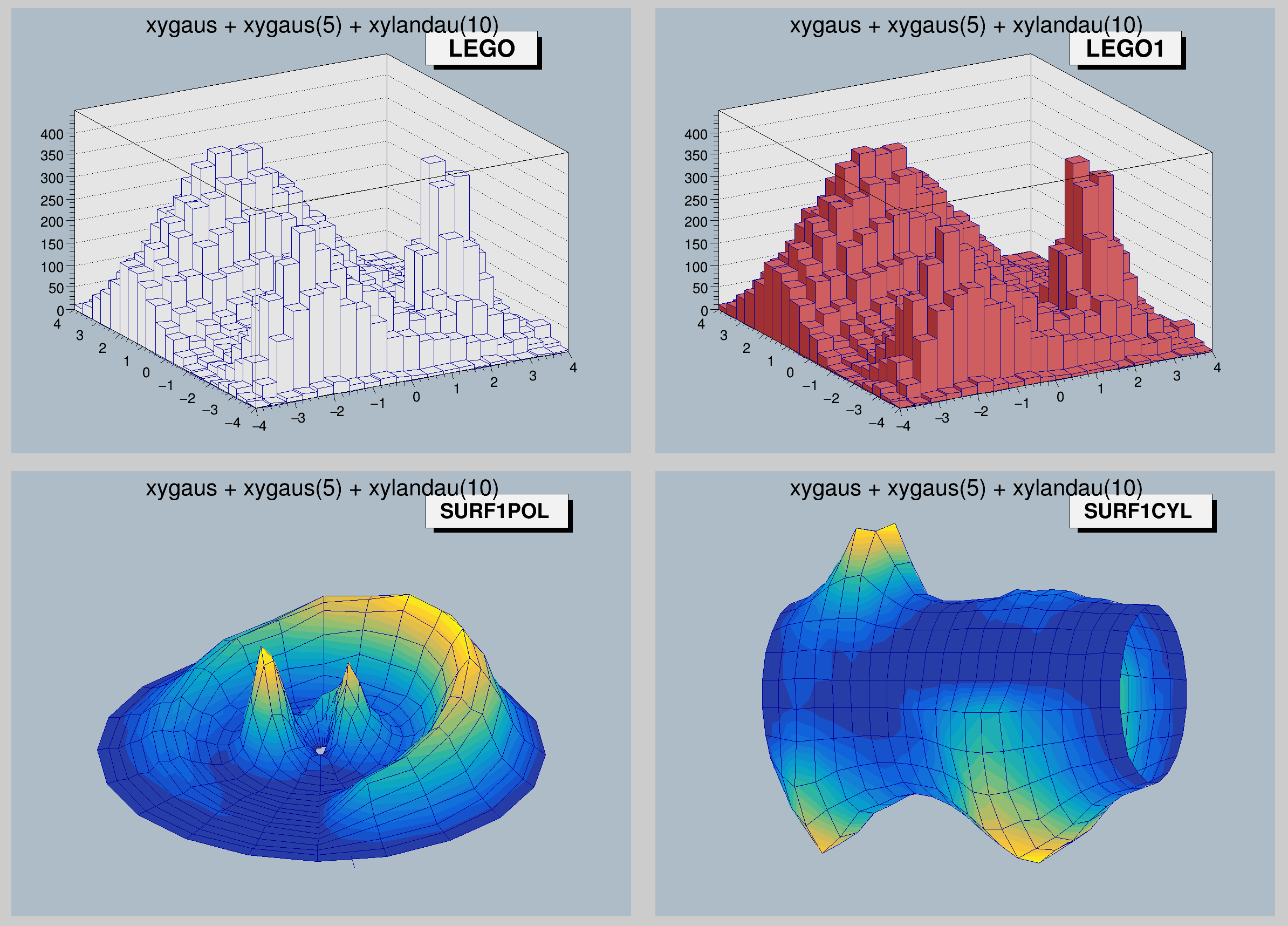 TF2 *f2 = new TF2("f2","xygaus + xygaus(5) + xylandau(10)",-4,4,-4,4);