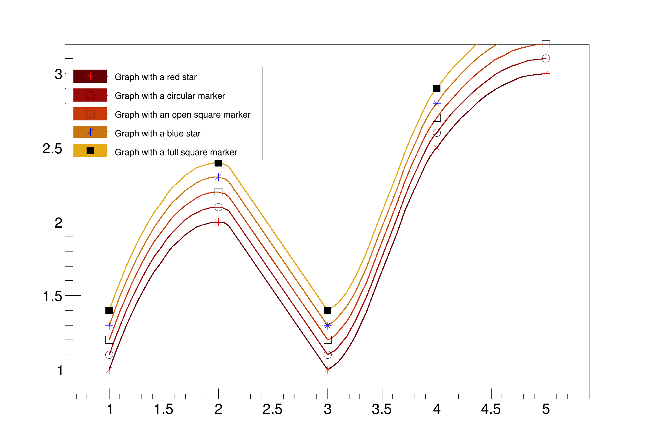 In this example five graphs are displayed with palette coloring for lines and and filled area. The graphs are drawn with curves (C option) and one can see the color of each graph is picked inside the palette kSolar. The same is visible on filled polygons in the automatically built legend.