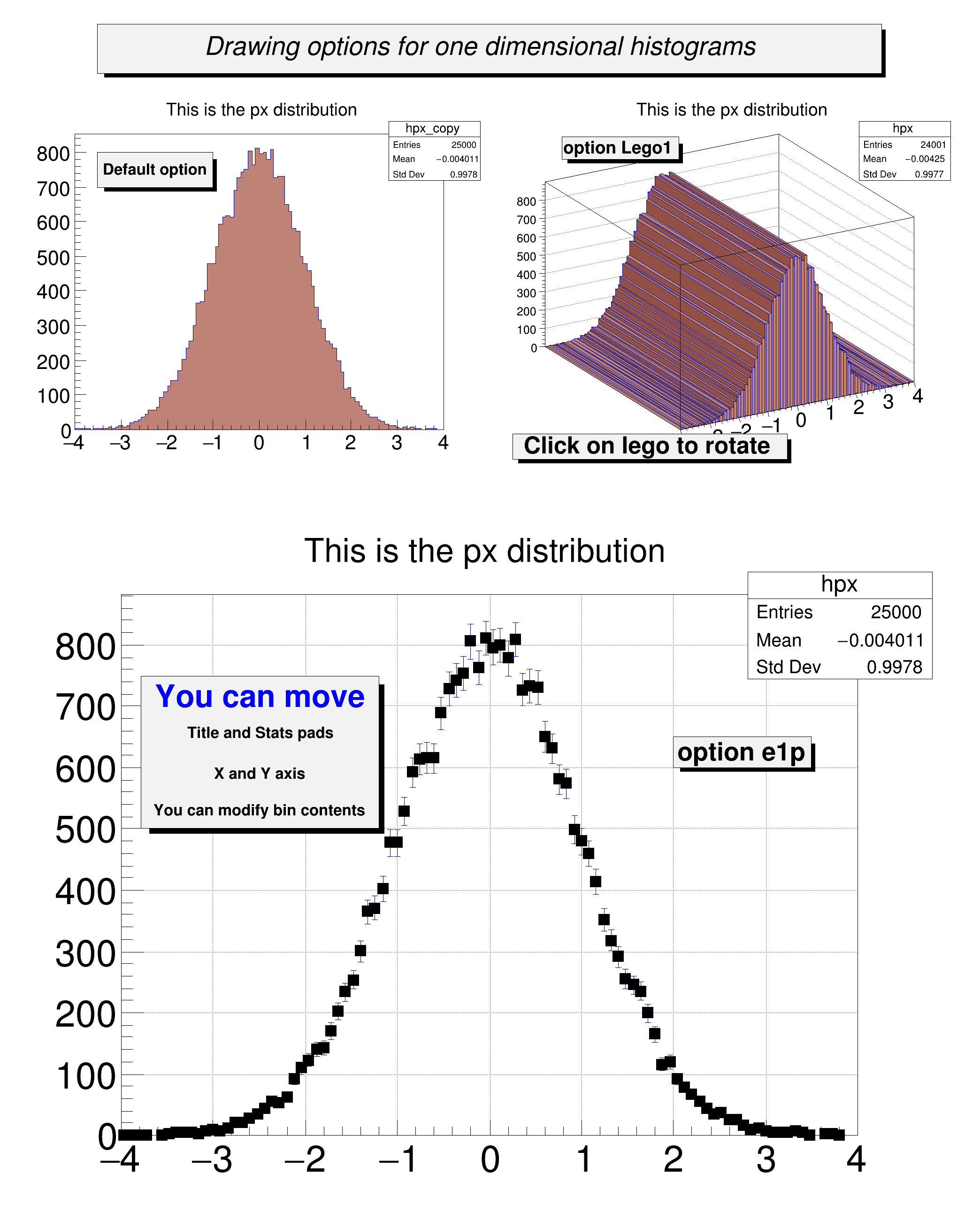 We attach (or generate) the ROOT file in $ROOTSYS/tutorials/hsimple.root or $PWD/hsimple.root We draw one histogram in different formats.