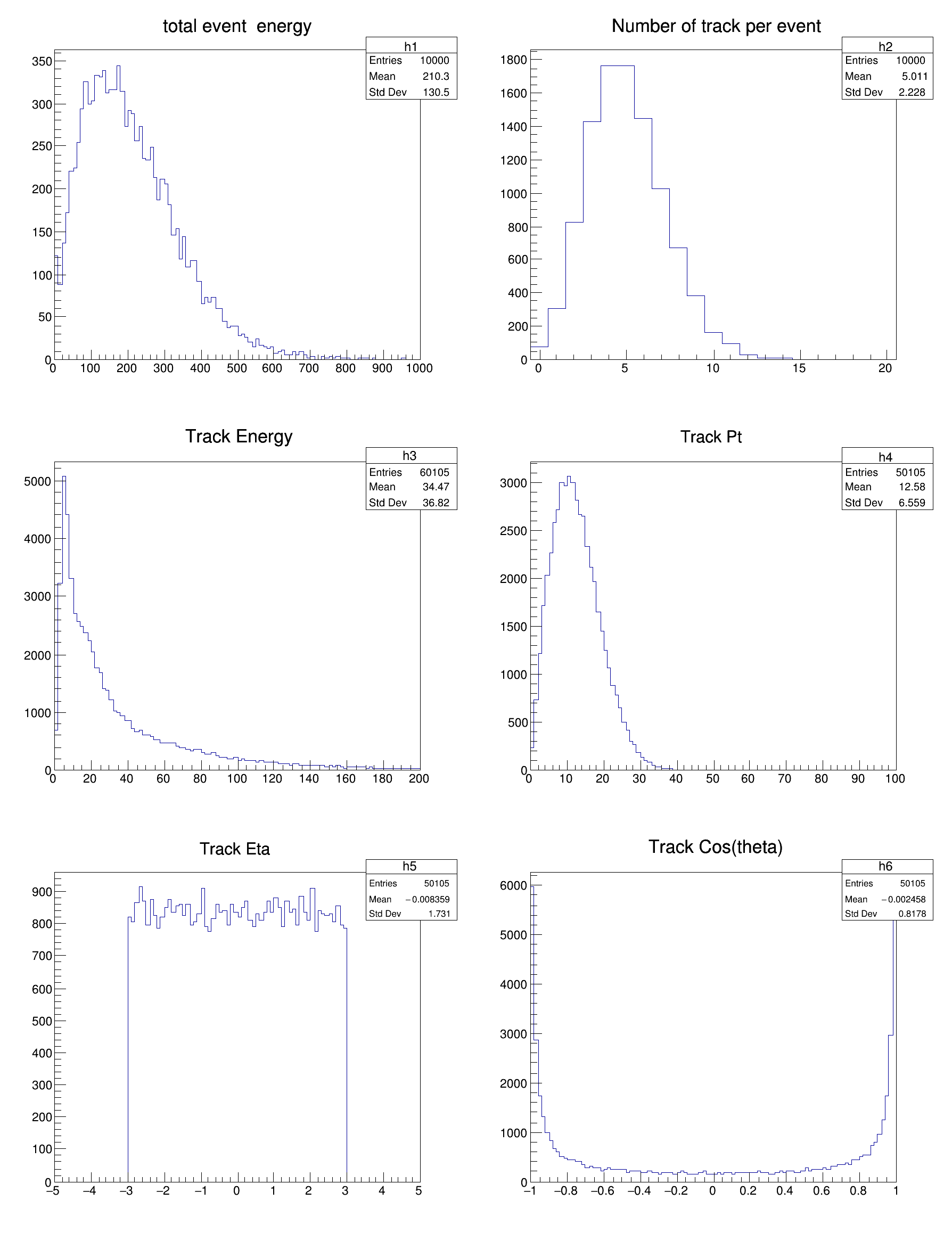 In the write() function a variable number of track Vectors is generated according to a Poisson distribution with random momentum uniformly distributed in phi and eta. In the read() the vectors are read back and the content analysed and some information such as number of tracks per event or the track pt distributions are displayed in a canvas.