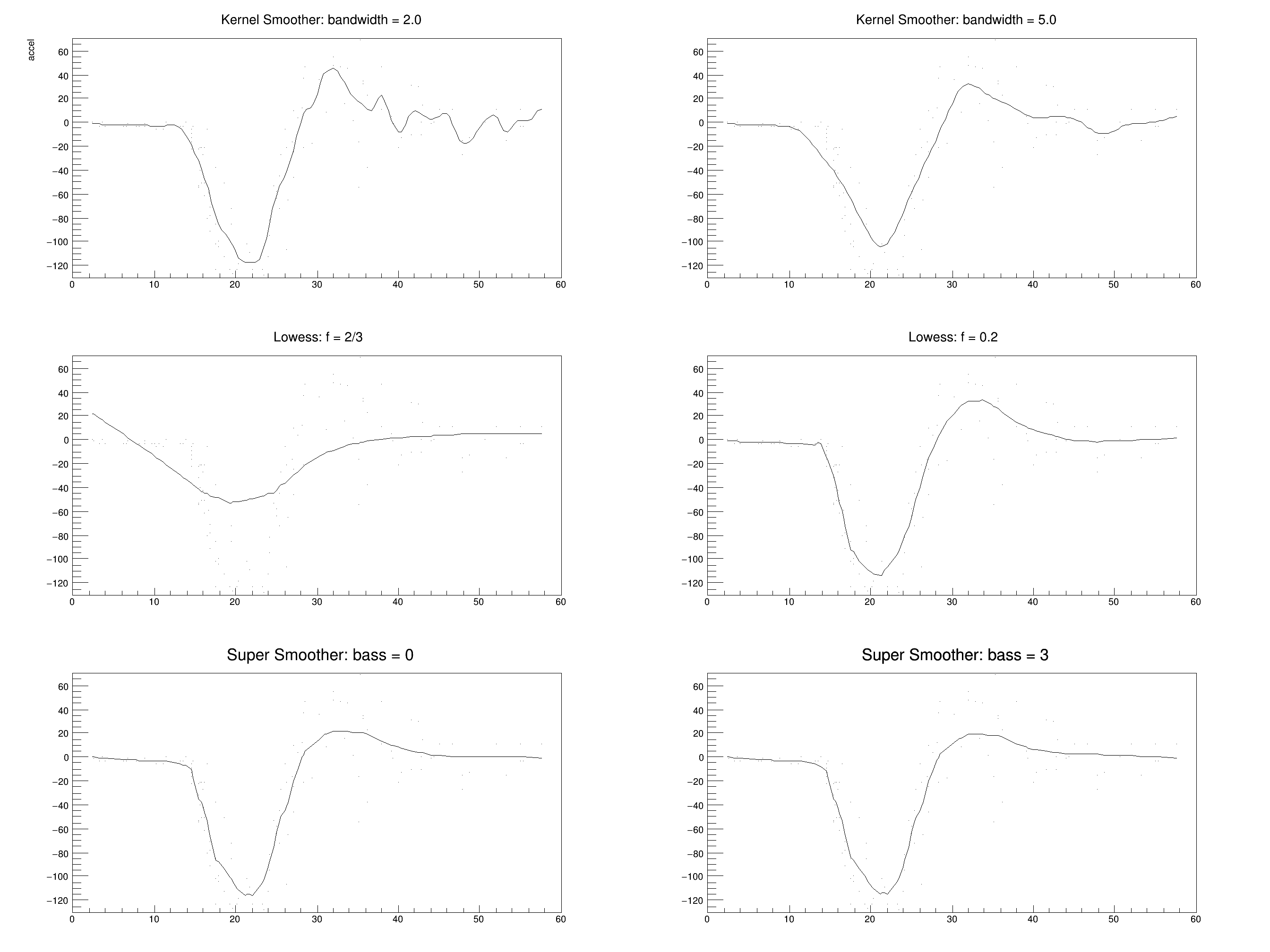 Example is a set of data on 133 observations of acceleration against time for a simulated motorcycle accident, taken from Silverman (1985).