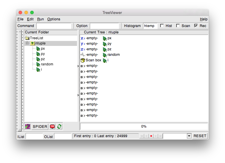 - a toolbar in the upper part where you can issue user commands, change the drawing option and the histogram name, three check buttons Hist, Rec and Scan.HIST toggles histogram drawing mode, REC enables recording of the last command issued and SCAN enables redirecting of TTree::Scan command in an ASCII file (see -Scanning expressions-);