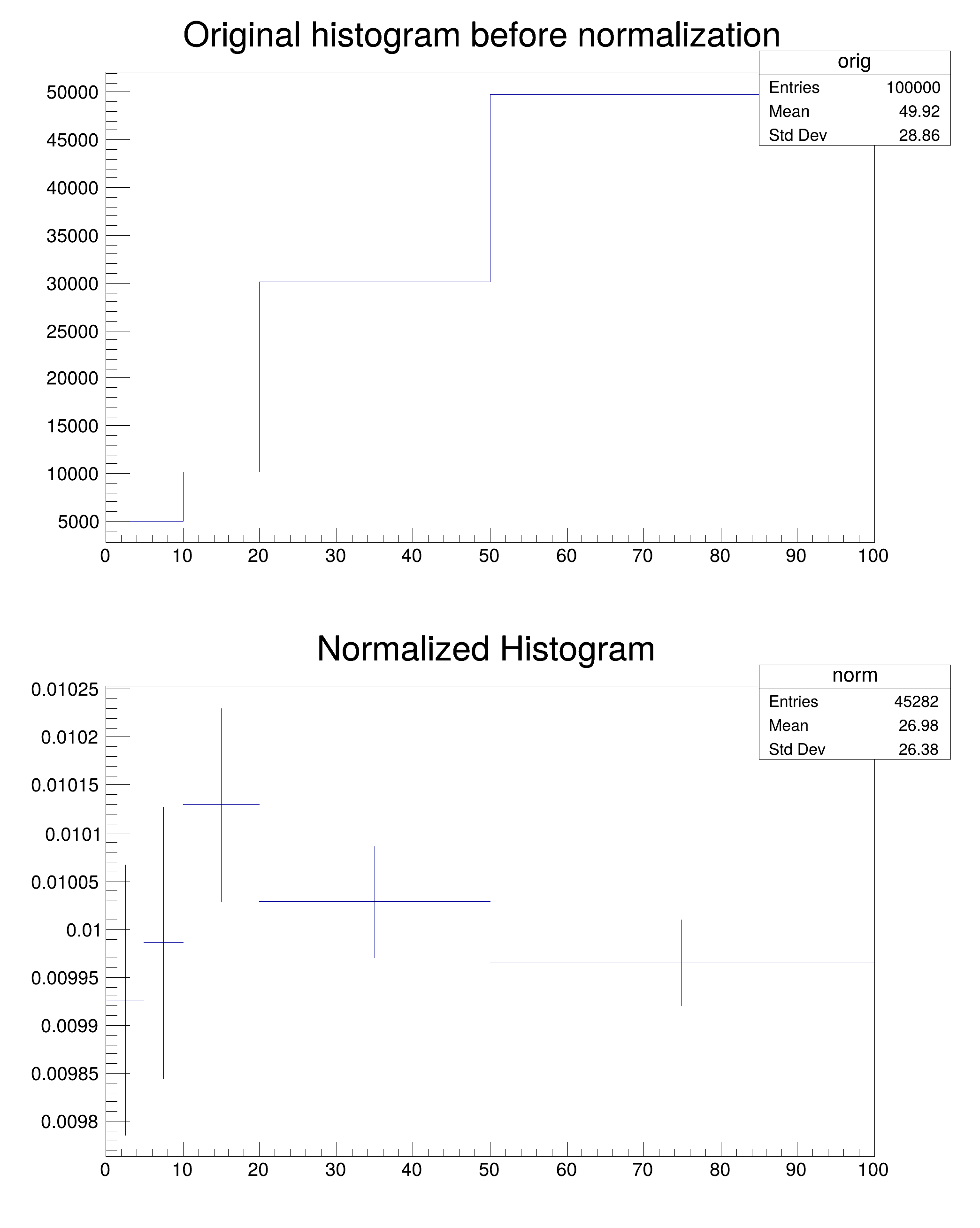 Image produced by .x NormalizeHistogram.C Two different methods of normalizing histograms are shown, each with the original histogram. next to the normalized one.