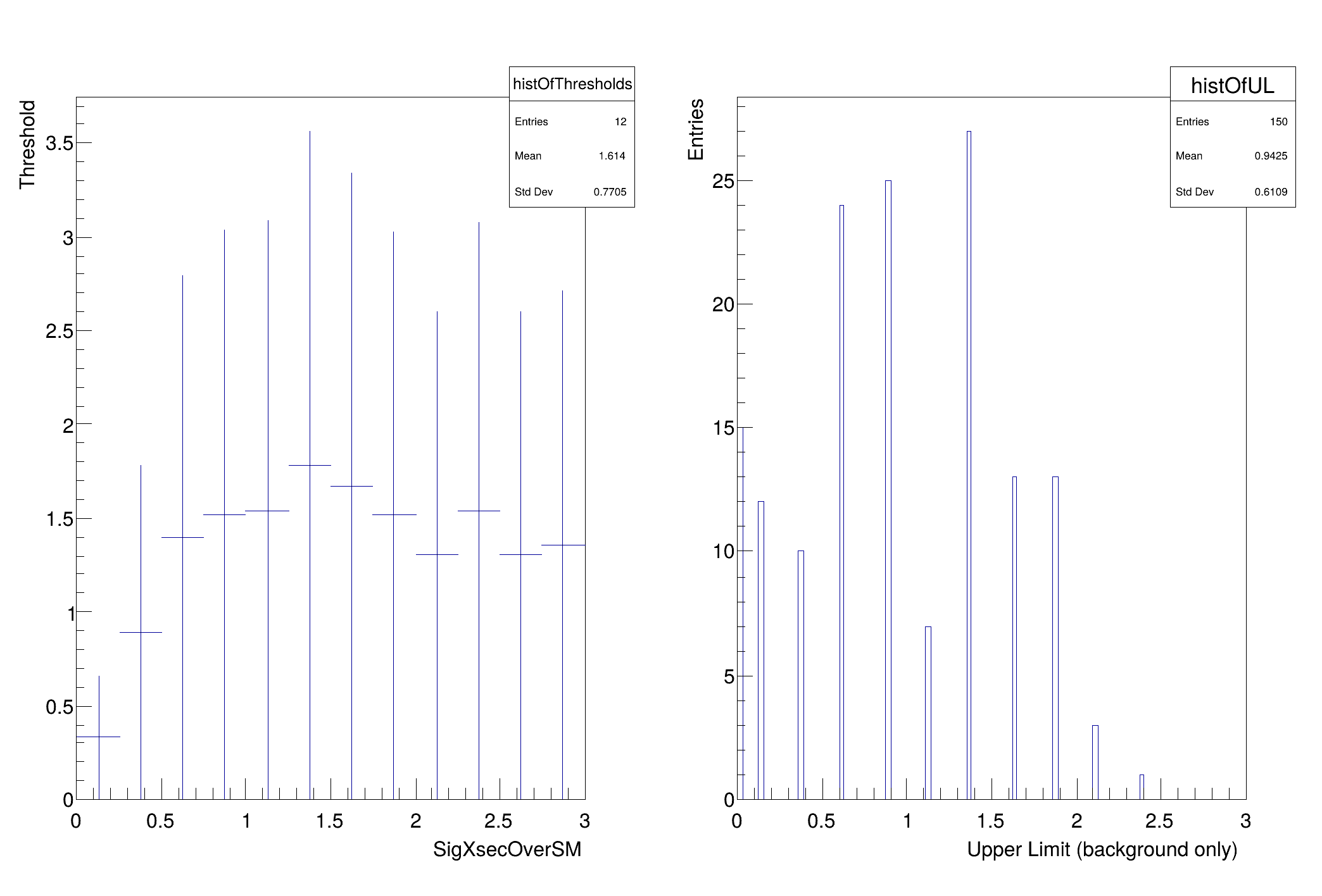 this tells you the values of the parameters being used to generate the pseudo-experiments and the threshold in this case is 0.011215. One would expect for 95% that the threshold would be ~1.35 once the cross-section is far enough away from 0 that it is essentially unaffected by the boundary. As one reaches the last points in the scan, the threshold starts to get artificially high. This is because the range of the parameter in the fit is the same as the range in the scan. In the future, these should be independently controlled, but they are not now. As a result the ~50% of pseudo-experiments that have an upward fluctuation end up with muhat = muMax. Because of this, the upper range of the parameter should be well above the expected upper limit... but not too high or one will need a very large value of nPointsToScan to resolve the relevant region. This can be improved, but this is the first version of this script.