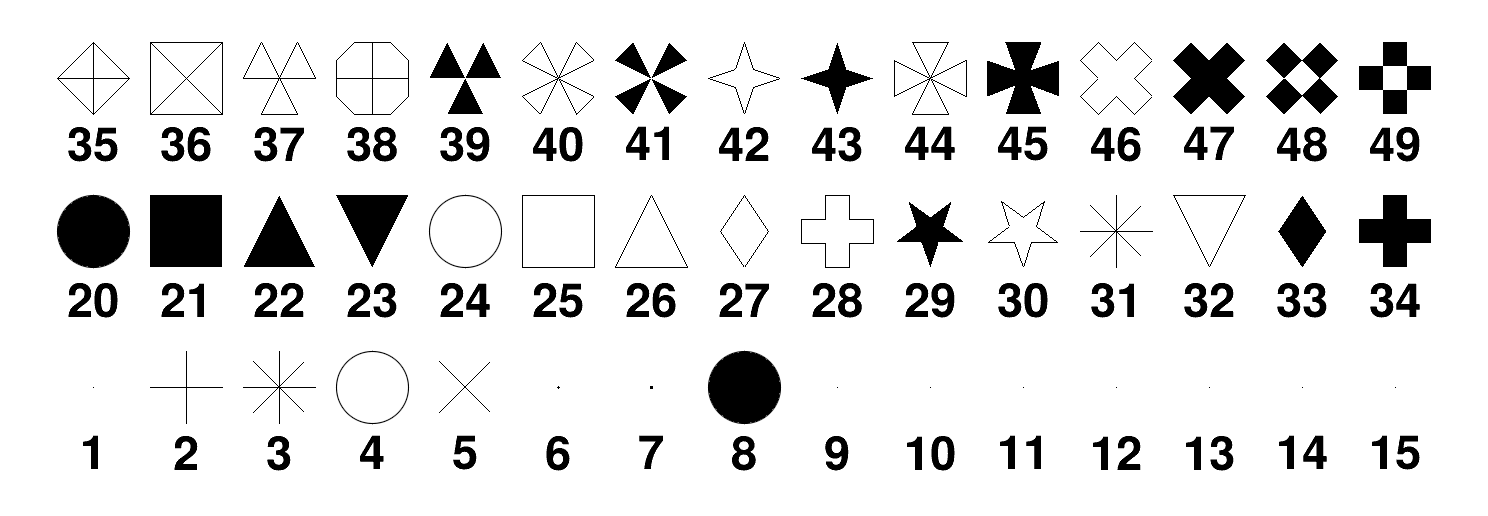 The following list gives the currently supported markers (screen and PostScript) style. Each marker style is identified by an integer number (first column) corresponding to a marker shape (second column) and can be also accessed via a global name (third column).