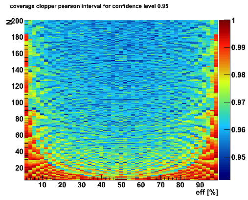 The following pictures illustrate the actual coverage probability for the different values of the true efficiency and the total number of events when a confidence level of 95% is desired.