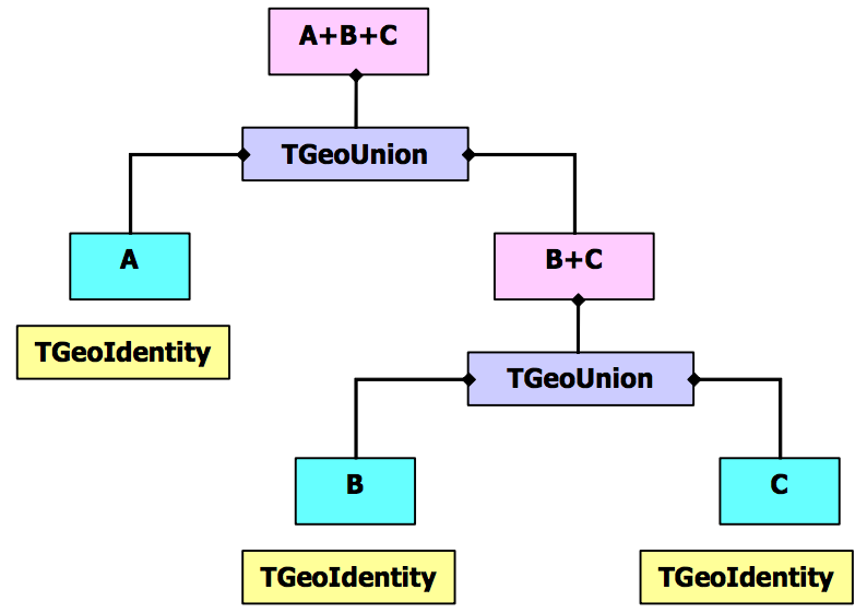 The first(+) is taken as separator, hence the expression split in: A and (B+C). A Boolean node of type **TGeoUnion**("A","B+C") is created. This tries to replace the 2 expressions by actual pointers to corresponding shapes. The first expression (A) contains no operators therefore is interpreted as representing a shape. The shape named "A" is searched into the list of shapes handled by the manager class and stored as the "left" shape in the Boolean union node. Since the second expression is not yet fully decomposed, the "right" shape in the combination is created as a new composite shape. This will split at its turn B+C into B and C and create a **TGeoUnion**("B","C"). The B and C identifiers will be looked for and replaced by the pointers to the actual shapes into the new node. Finally, the composite "`A+B+C`" will be represented as shown in Fig.17-23.**
