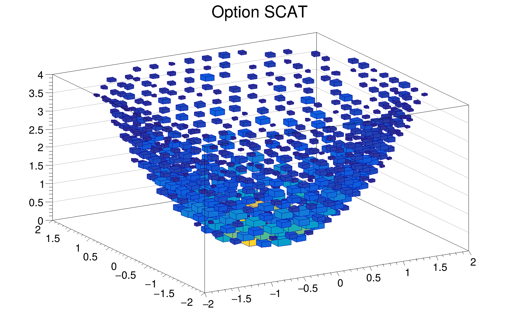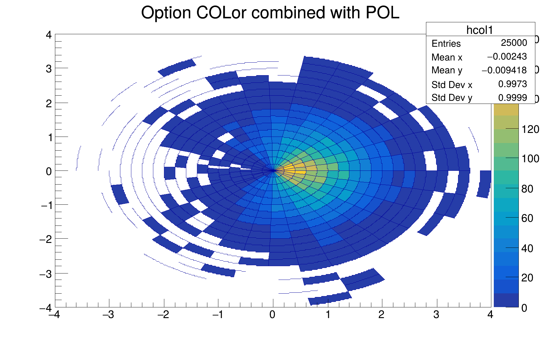 | "COL" | A box is drawn for each cell with a color scale varying with contents. All the none empty bins are painted. Empty bins are not painted unless some bins have a negative content because in that case the null bins might be not empty. TProfile2D histograms are handled differently because, for this type of 2D histograms, it is possible to know if an empty bin has been filled or not. So even if all the bins' contents are positive some empty bins might be painted. And vice versa, if some bins have a negative content some empty bins might be not painted (default). |
