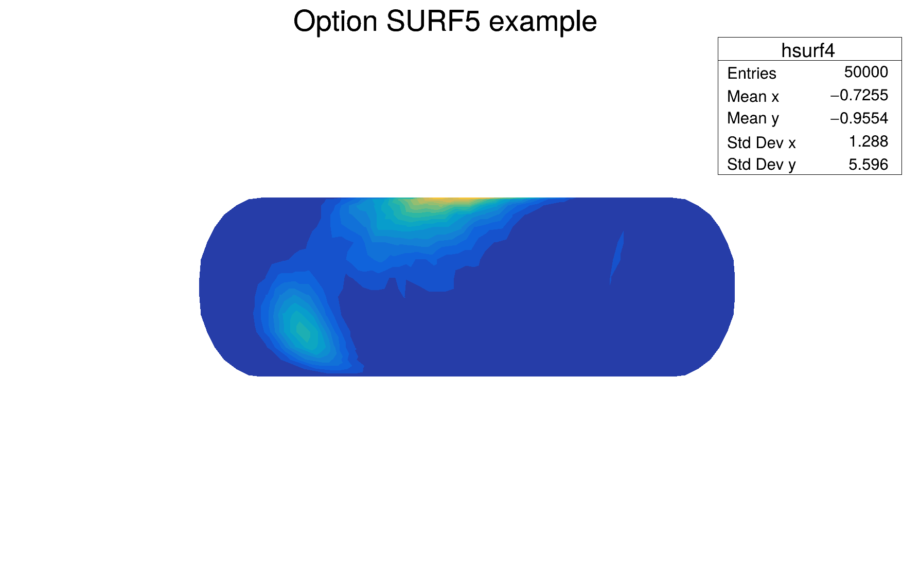 | "SURF5" | Same as SURF3 but only the colored contour is drawn. Used with option CYL, SPH or PSR it allows to draw colored contours on a sphere, a cylinder or a in pseudo rapidity space. In cartesian or polar coordinates, option SURF3 is used. |