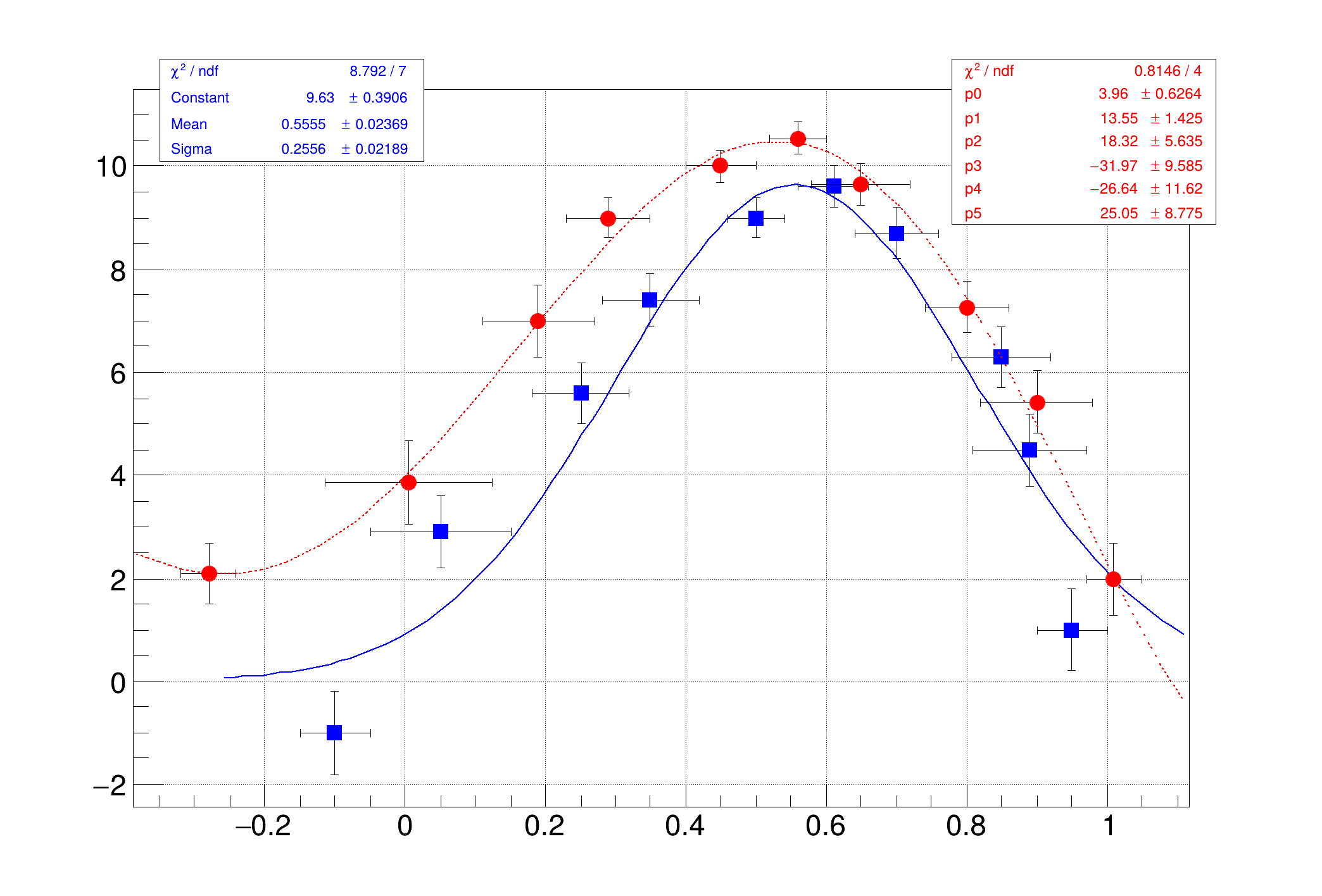 Parameters must be initialized before invoking the Fit function. The setting of the parameter initial values is automatic for the predefined functions : poln, expo, gaus, landau. One can however disable this automatic computation by specifying the option "B". You can specify boundary limits for some or all parameters via