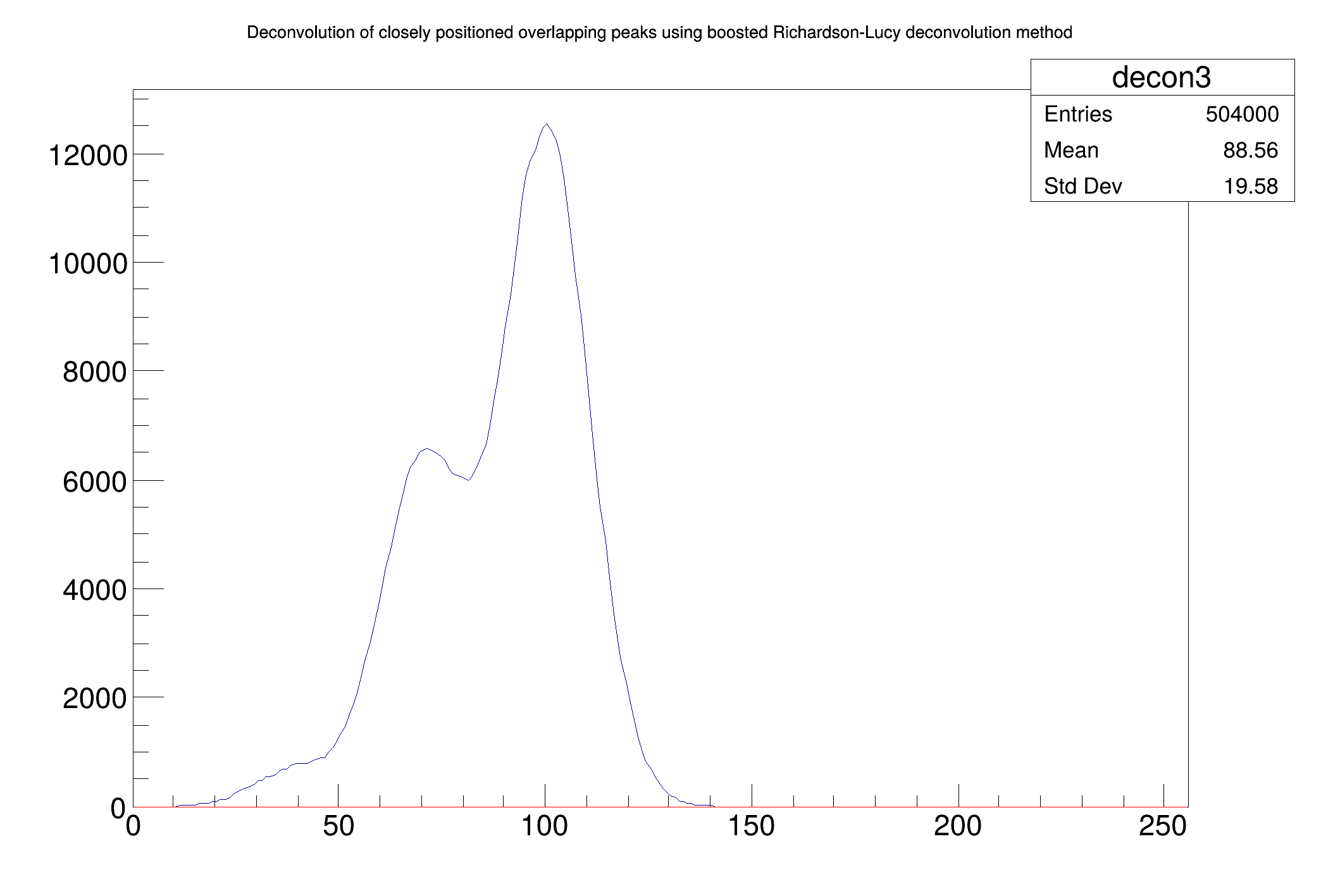 Example of Richardson-Lucy deconvolution for closely positioned wide peaks. The original source spectrum is drawn with black color, the spectrum after the deconvolution (10000 iterations) with red color.
