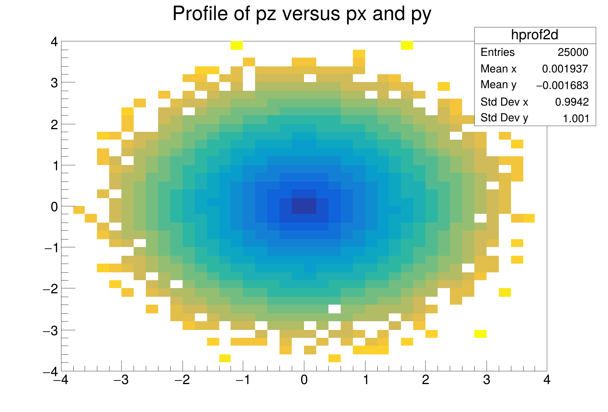 hprof2d = d.Profile2D(("hprof2d", "Profile of pz versus px and py", 40, -4, 4, 40, -4, 4, 0, 20), "px", "py", "pz")