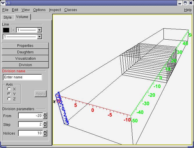 In the method above XXX represent some shape name (Box, Tube, etc.). This is just a simple way of creating a volume having a given shape in one-step (see also section: "Creating and Positioning Volumes"). As for REPLICA and ROOT volumes, they are just some "virtual volumes" used for grouping and positioning together other "real volumes". See "Positioned Volumes (Nodes)". The same structure represented by (a real or) a virtual volume can be "replicated" several times in the geometry.