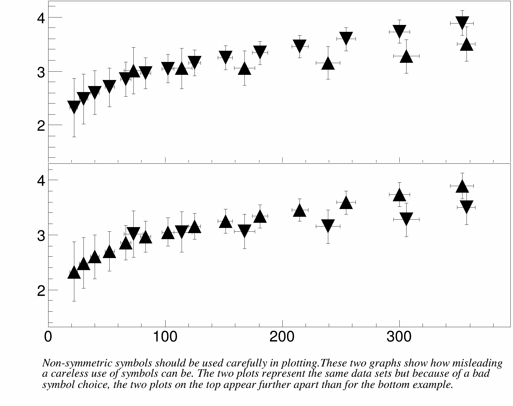 Non-symmetric symbols should be used carefully in plotting. These two graphs show how misleading a careless use of symbols can be. The two plots represent the same data sets but because of a bad symbol choice, the two plots on the top appear further apart than for the bottom example.