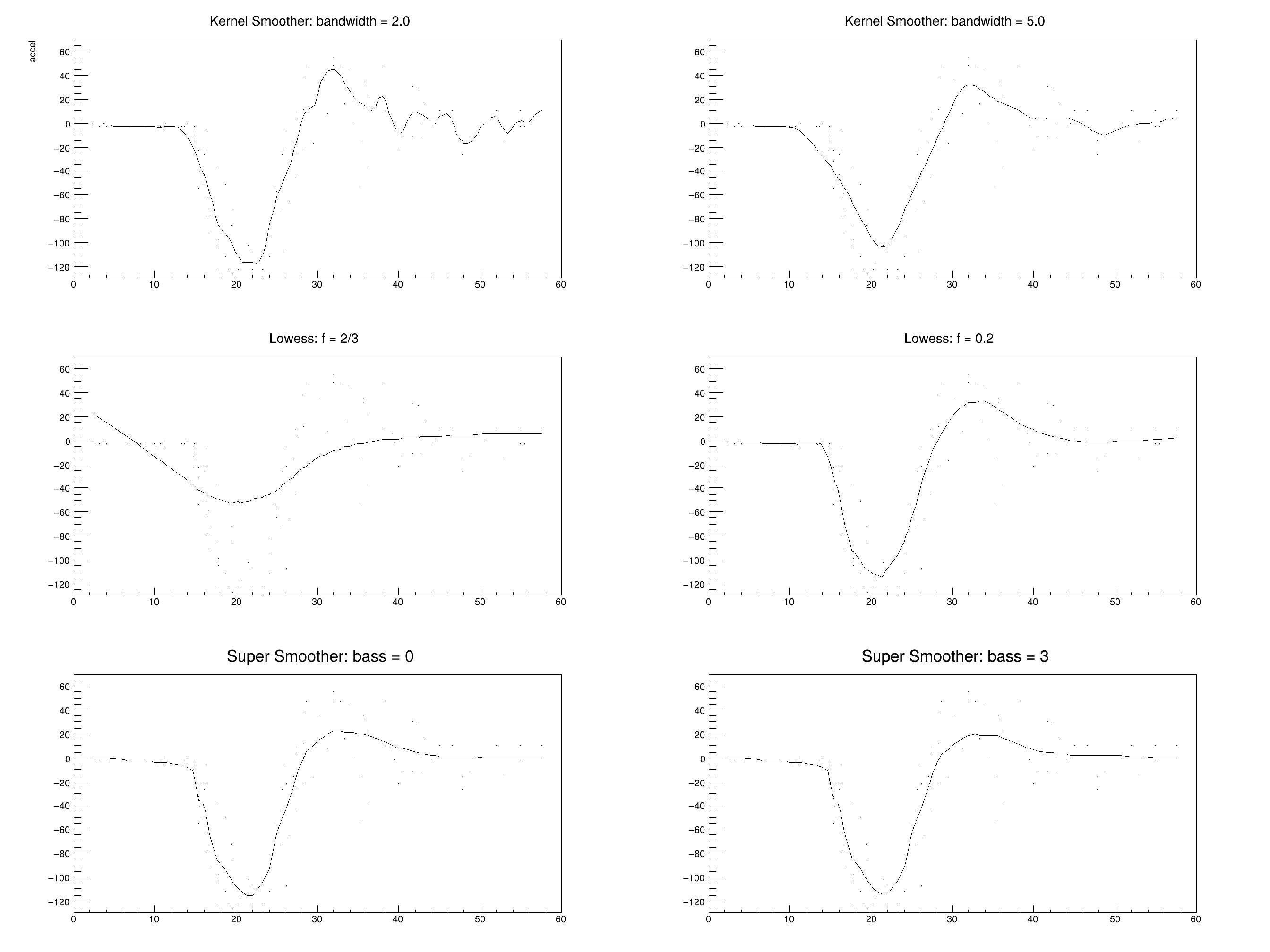 Example is a set of data on 133 observations of acceleration against time for a simulated motorcycle accident, taken from Silverman (1985).