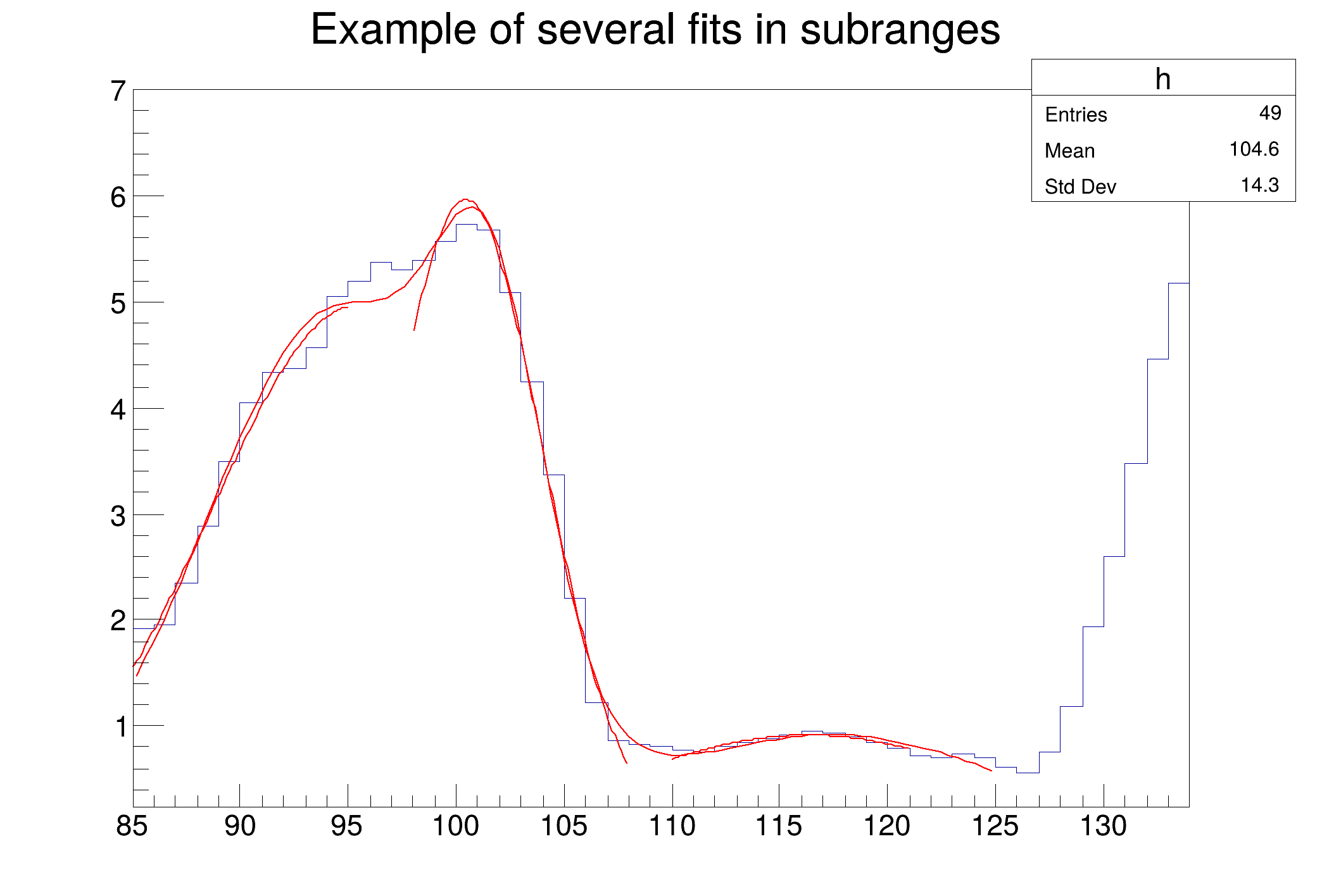 Fitting multiple functions to different ranges of a 1-D histogram Example showing how to fit in a sub-range of an histogram A histogram is created and filled with the bin contents and errors defined in the table below.