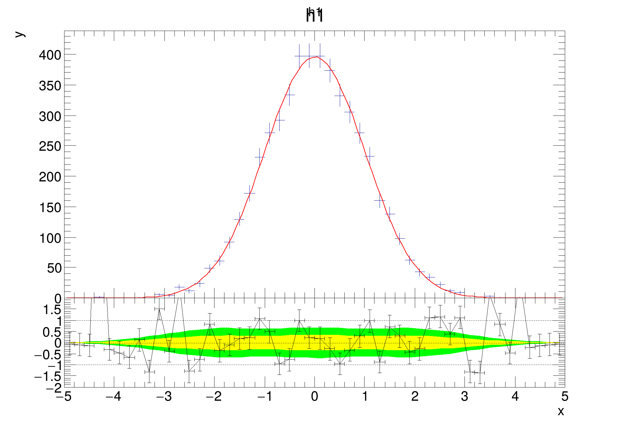 The last label of the lower plot's y axis is hidden automatically. Inspired by the tutorial of Paul Gessinger.