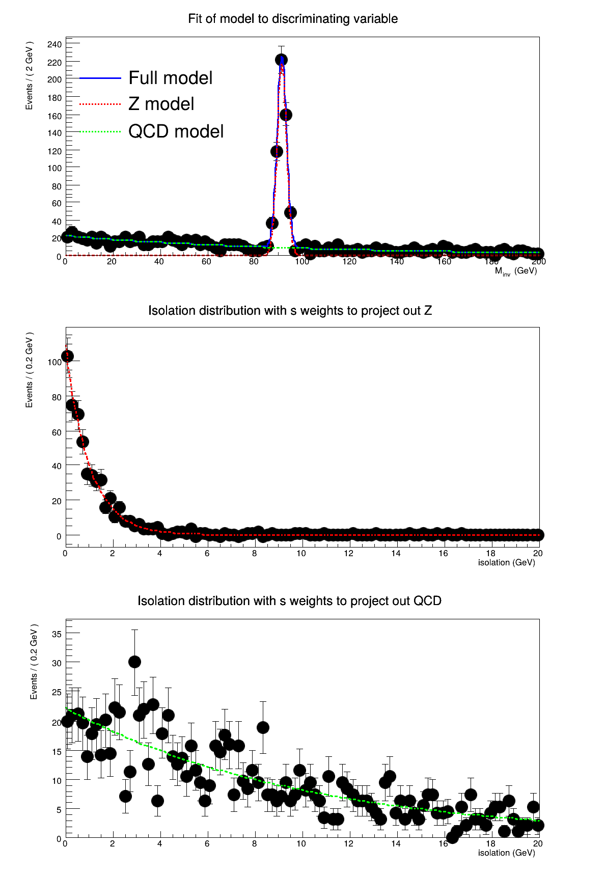 This tutorial shows an example of using SPlot to unfold two distributions. The physics context for the example is that we want to know the isolation distribution for real electrons from Z events and fake electrons from QCD. Isolation is our 'control' variable. To unfold them, we need a model for an uncorrelated variable that discriminates between Z and QCD. To do this, we use the invariant mass of two electrons. We model the Z with a Gaussian and the QCD with a falling exponential.