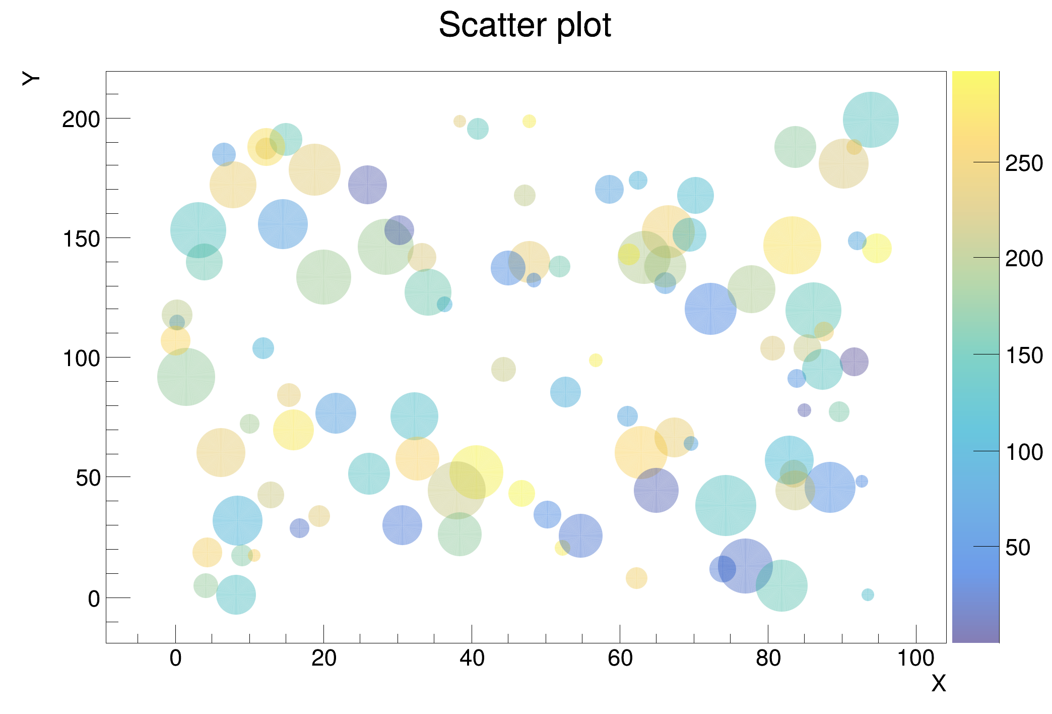 A TScatter is able to draw four variables scatter plot on a single plot.