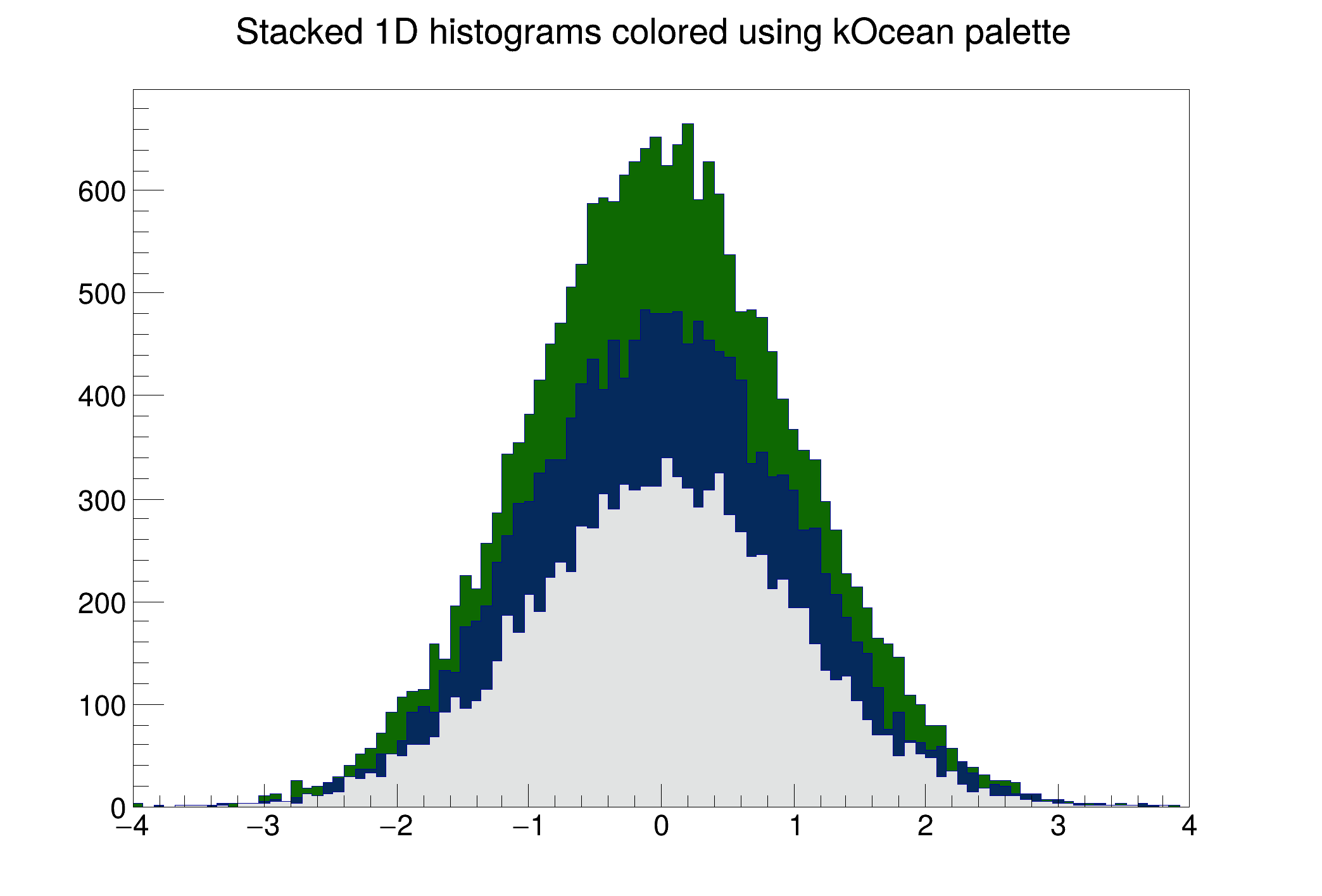 Palette coloring for histograms' stack is activated thanks to the options PFC (Palette Fill Color), PLC (Palette Line Color) and AMC (Palette Marker Color).