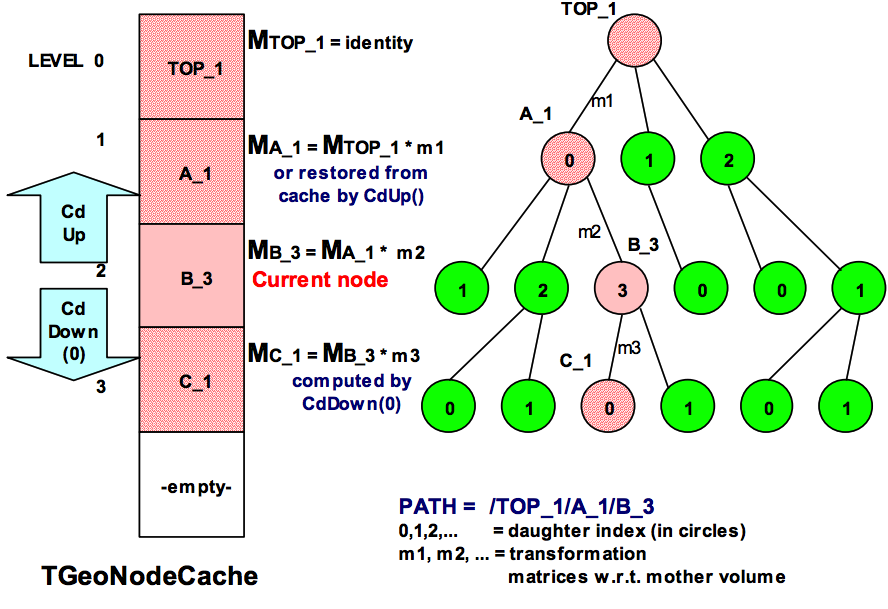 For reminder, a geometry state is a ‘touchable' object in the geometry hierarchy. It is represented by a path like: /TOP\_1/A\_1/B\_3/C\_1, where B\_3 for instance is a copy of volume B positioned inside volume A. A state is always associated to a transformation matrix M of the touchable with respect to the global reference frame (obtained by piling-up all local transformations of nodes in the branch with respect to their containers). The current state and the corresponding global matrix are updated whenever the geometry depth is modified. The global transformations corresponding to all nodes in the current branch are kept in an array: (MTOP\_1, MA\_1, MB\_3, ...).