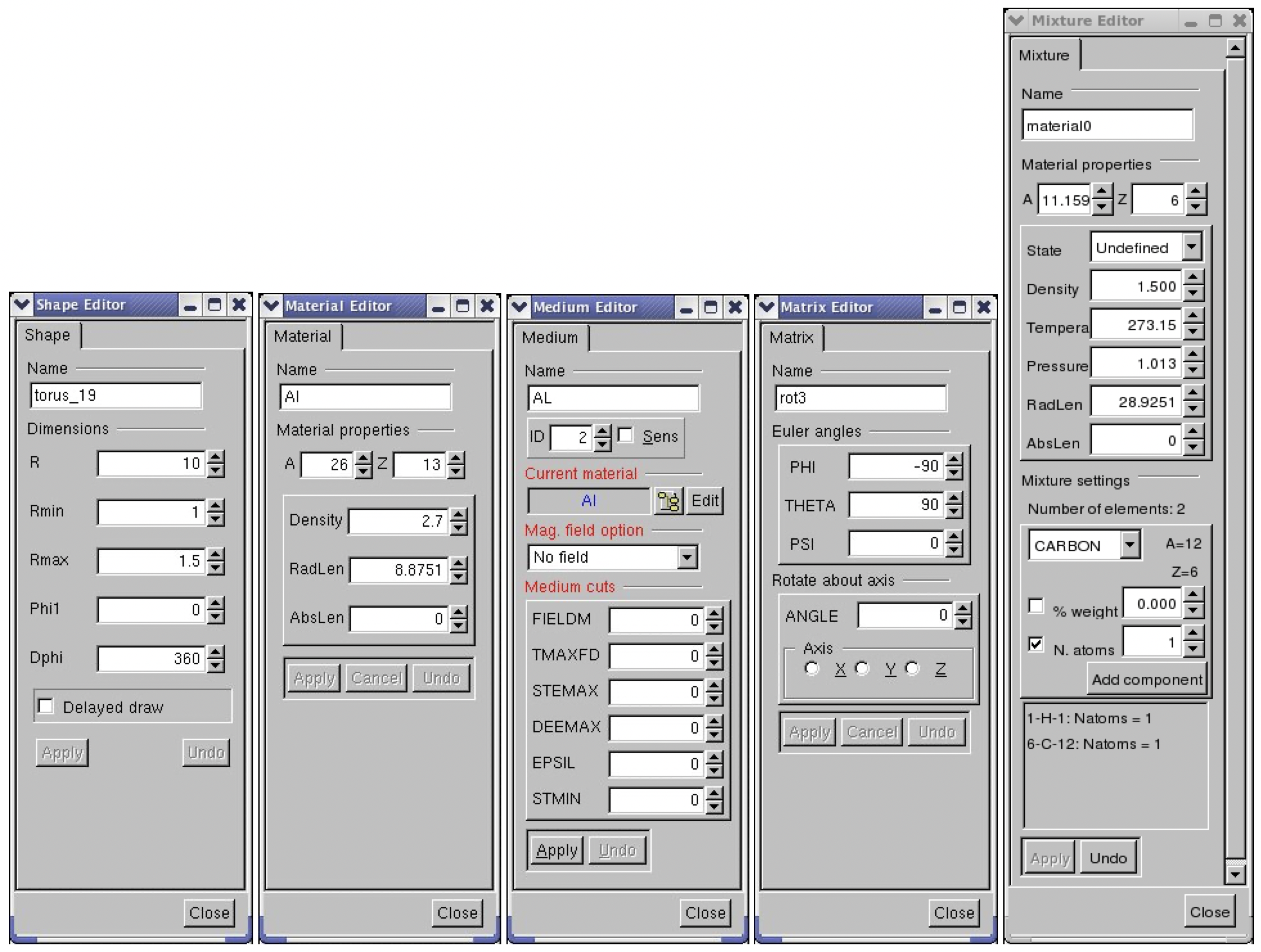 that provides a graphics user interface allowing to edit some (or all) parameters of a geometry object. The editable objects are geometry manager, volumes, nodes, shapes, media, materials and matrices. The interfaces provide also access to specific functionality of geometry objects. The editing mechanism is based on ROOT GED (Graphics Editors) functionality and the library is loaded using the plug-in mechanism.