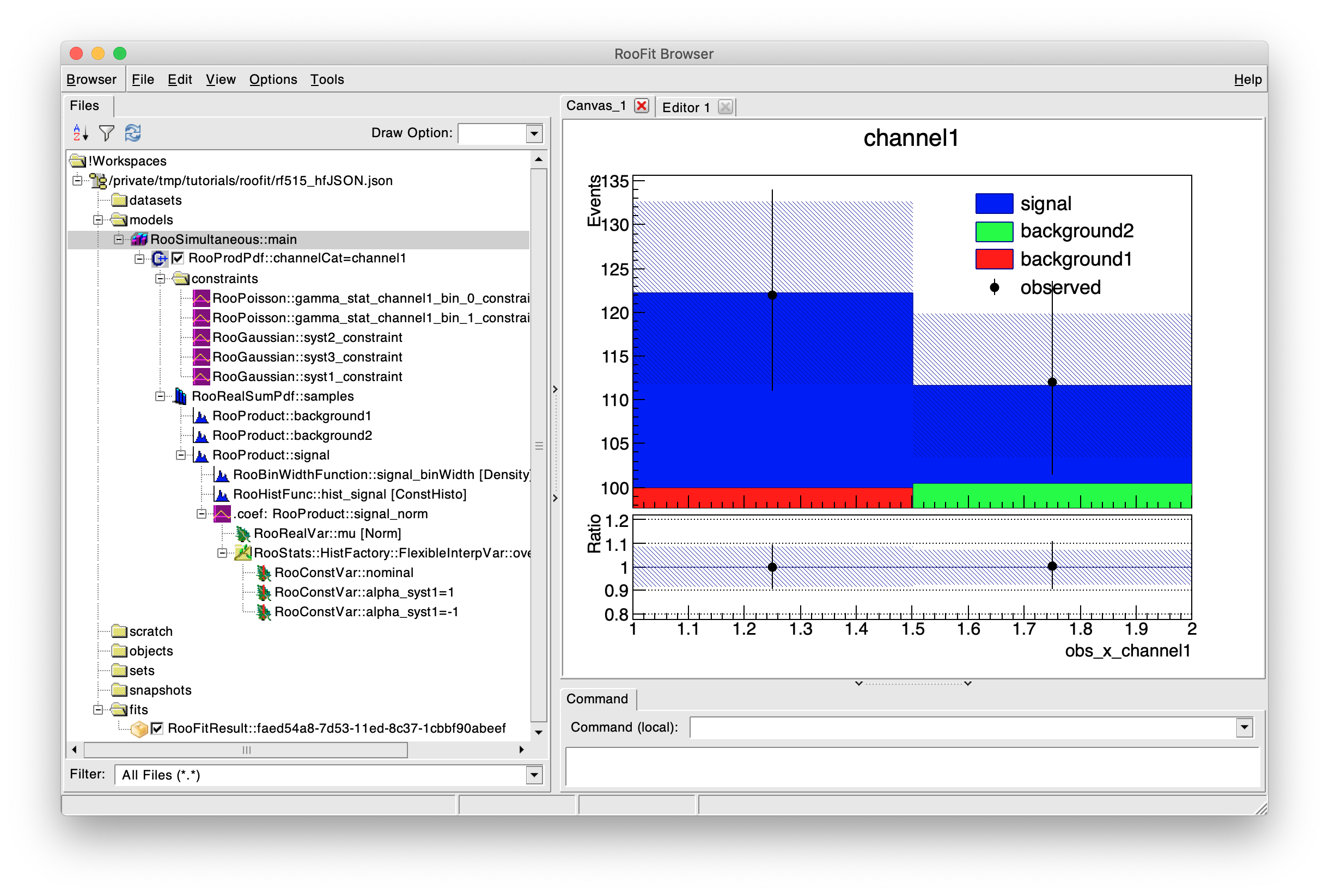 To get started with the xRooBrowser, open any ROOT file containing a workspace and then create an instance of the xRooBrowser just like creating an instance of a TBrowser. A window will be displayed with a navigable tree structure on the left that lets you explore the content of the workspaces present in the loaded file. Note that additional files, including json workspace files, can be loaded through the Browser --> Open menu in the top left corner.