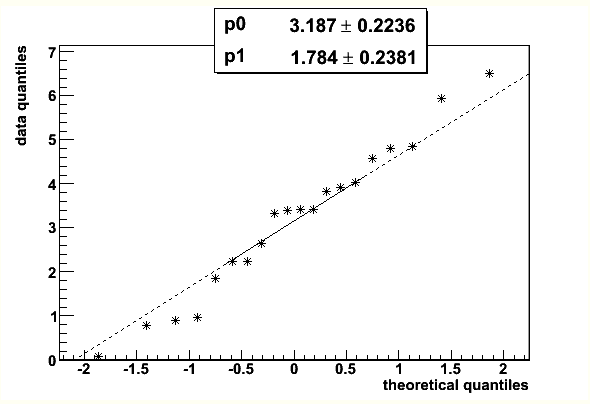 Example of a qq-plot of a dataset from N(3, 2) distribution and TMath::Gaus(0, 1) theoretical function. Fitting parameters are estimates of the distribution mean and sigma.