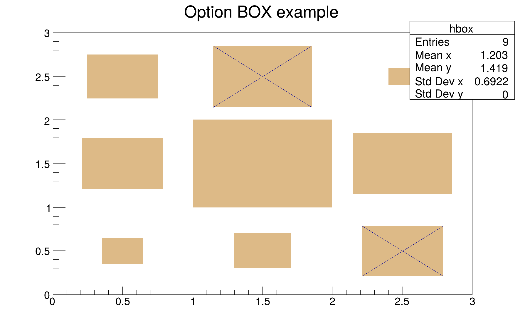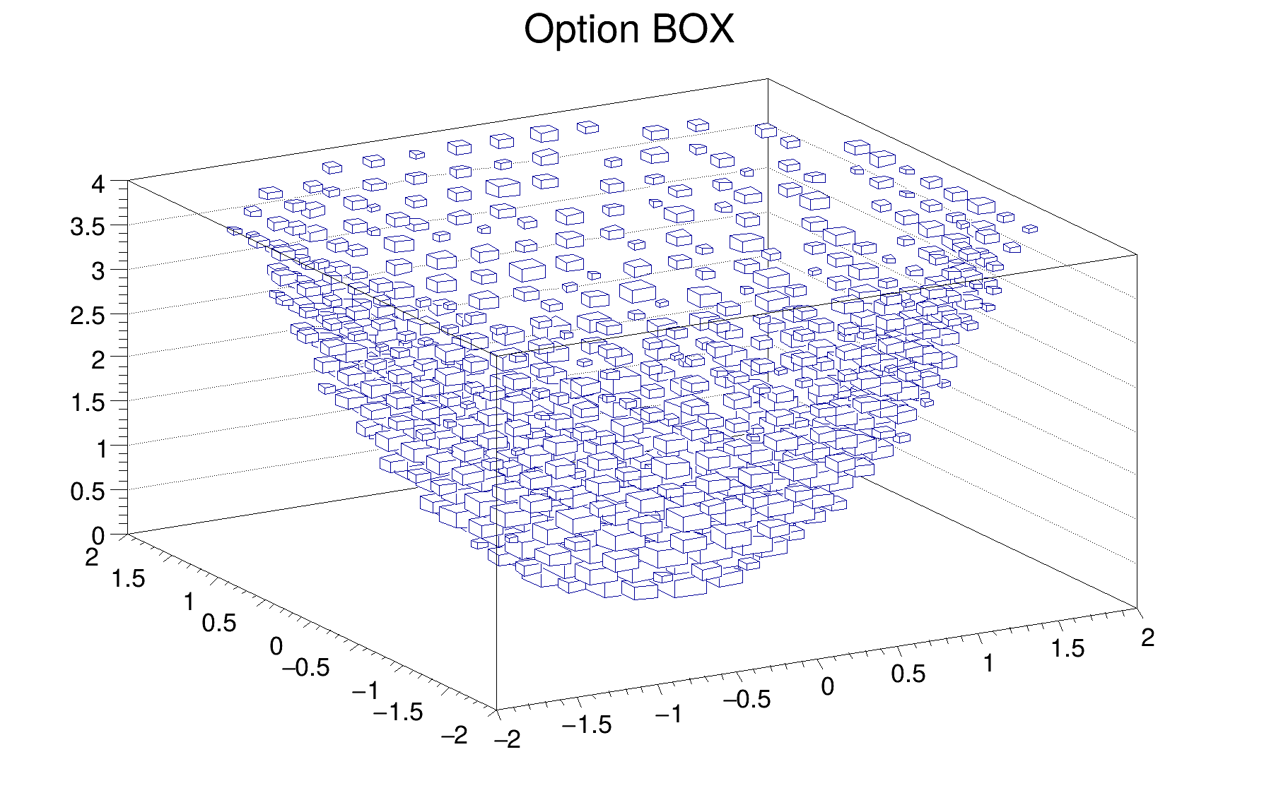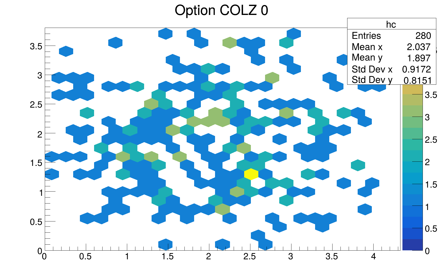 | "COL" | A box is drawn for each cell with a color scale varying with contents. All the none empty bins (bins with content and error equal to 0) are painted. Empty bins are not painted unless some bins have a negative content because in that case the null bins might be not empty. TProfile2D histograms are handled differently because, for this type of 2D histograms, it is possible to know if an empty bin has been filled or not. So even if all the bins' contents are positive some empty bins might be painted. And vice versa, if some bins have a negative content some empty bins might be not painted (default). |