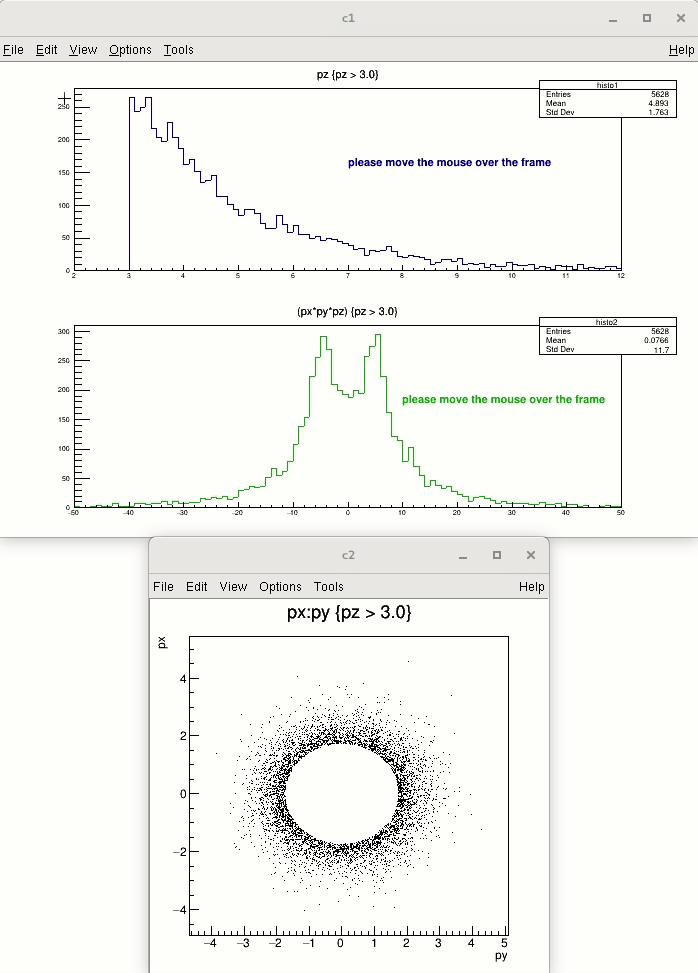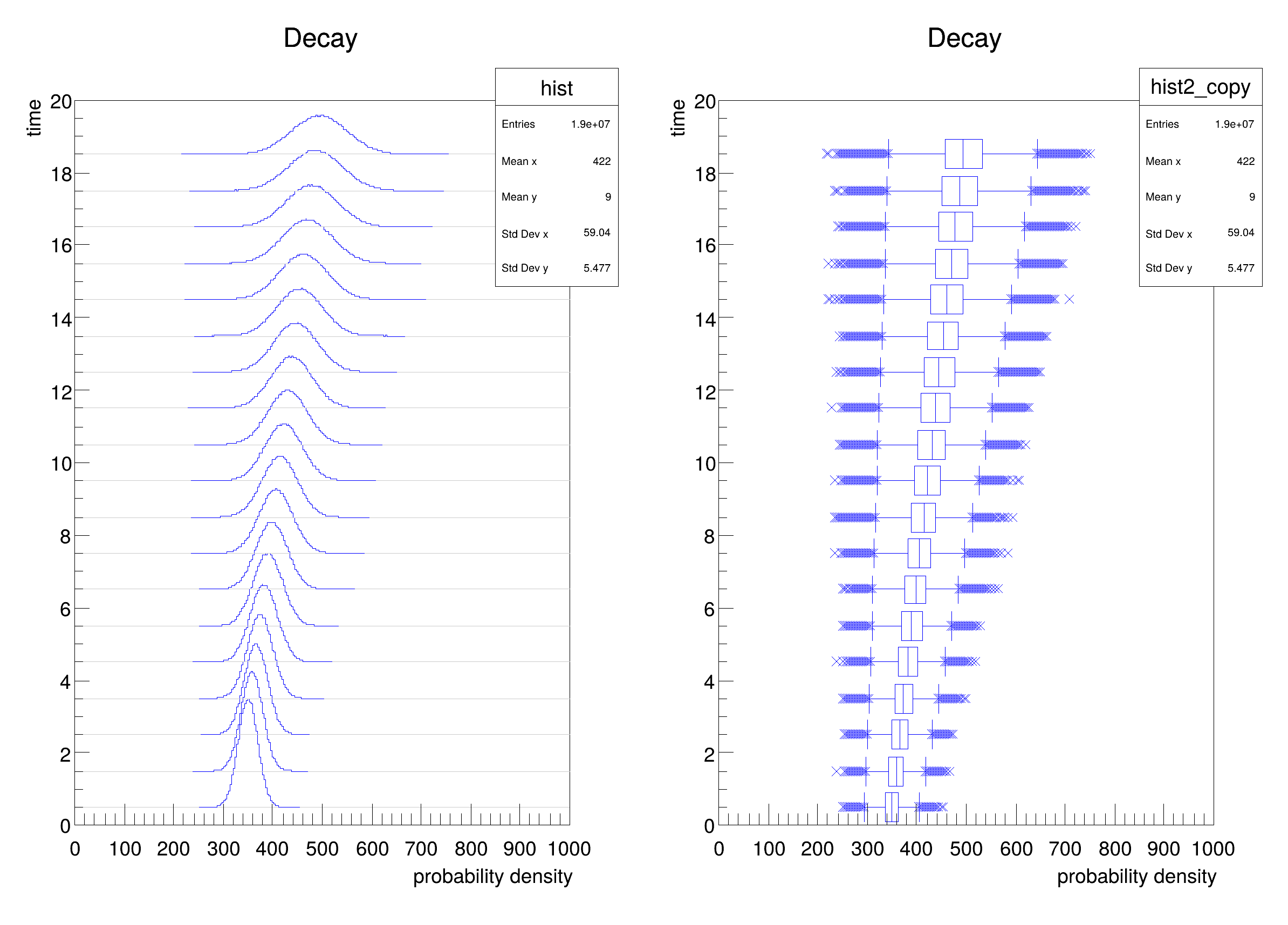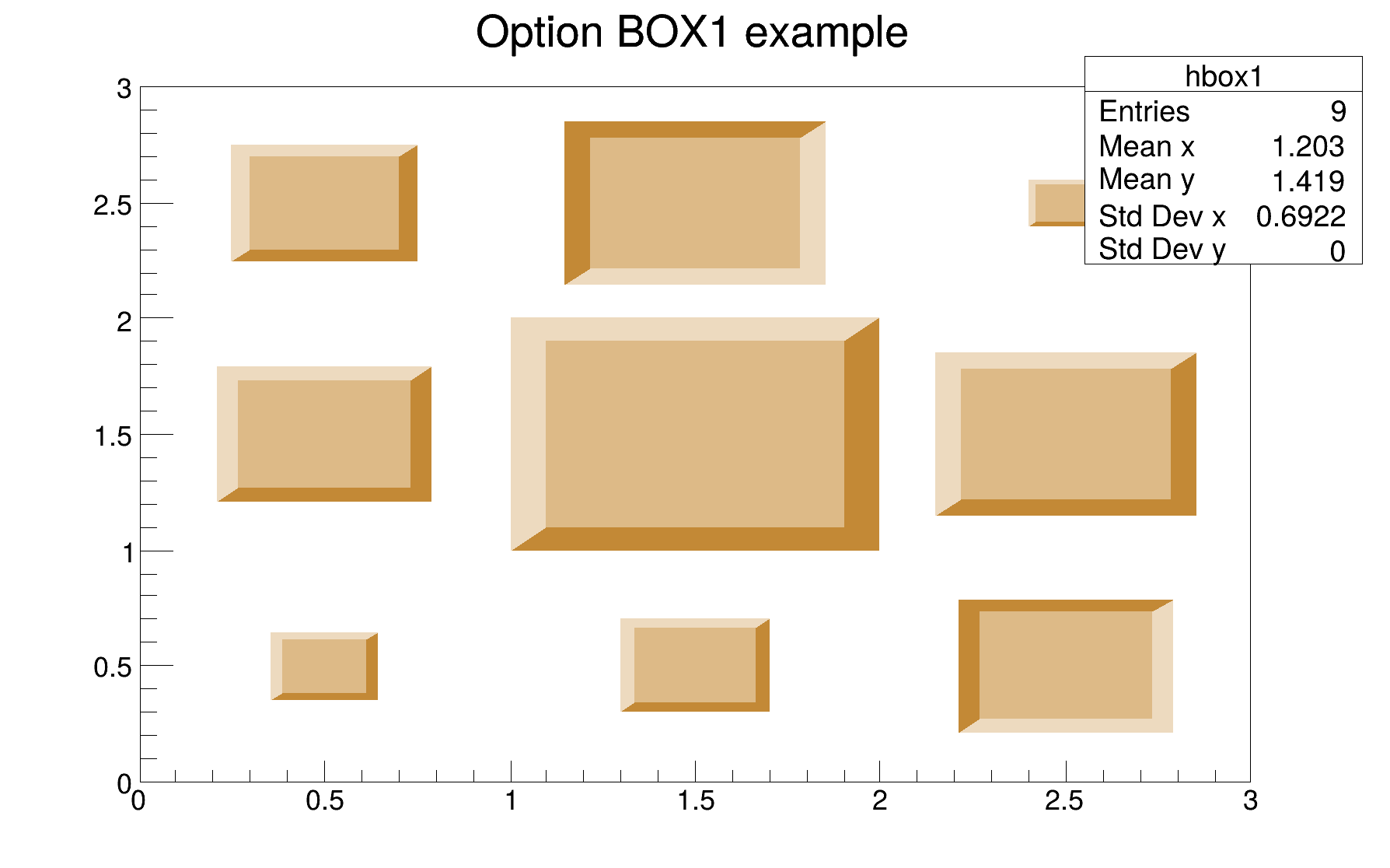 | "COL" | A box is drawn for each cell with a color scale varying with contents. All the none empty bins (bins with content and error equal to 0) are painted. Empty bins are not painted unless some bins have a negative content because in that case the null bins might be not empty. TProfile2D histograms are handled differently because, for this type of 2D histograms, it is possible to know if an empty bin has been filled or not. So even if all the bins' contents are positive some empty bins might be painted. And vice versa, if some bins have a negative content some empty bins might be not painted (default). |