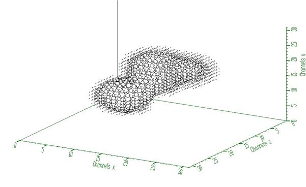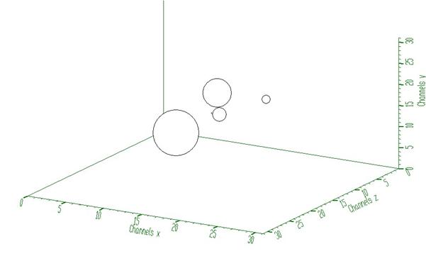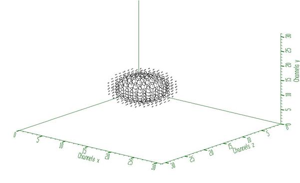 is the probability of the change of the peak position from channel i to the channel i+1. \(A_i\) is the normalization constant so that \( p_{i,i-1}+p_{i,i+1}=1\) and m is a width of smoothing window. We have extended this algorithm to three dimensions.