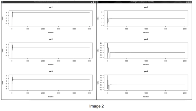 In the image you can see the convergence plots of the functions and their minimum. For RosenBrock is (1,1,1) and for Rastrigin is (0,0,0).