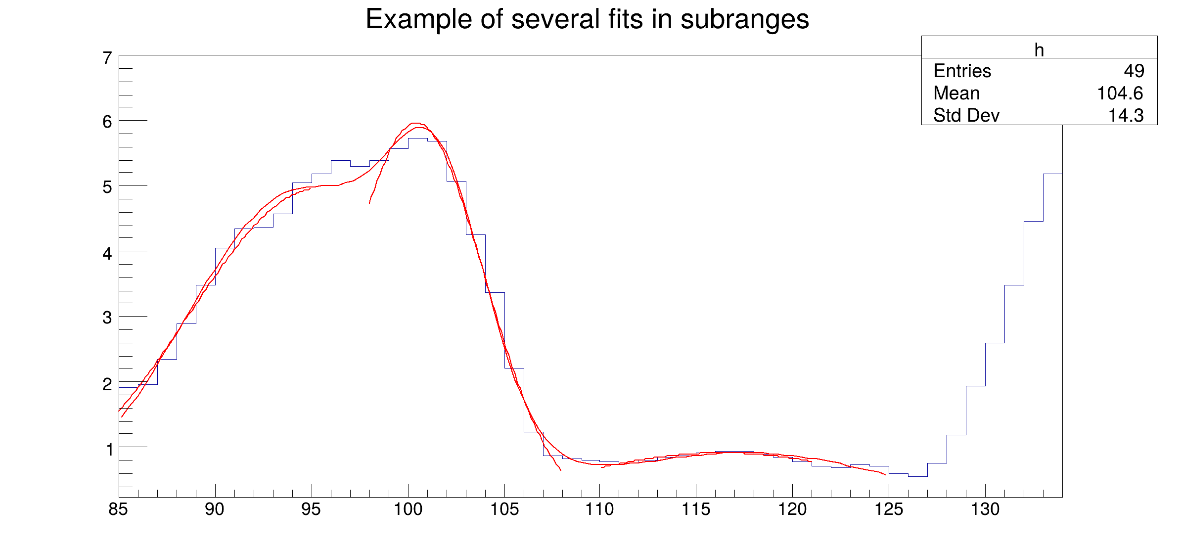 Fitting multiple functions to different ranges of a 1-D histogram Example showing how to fit in a sub-range of an histogram A histogram is created and filled with the bin contents and errors defined in the table below.