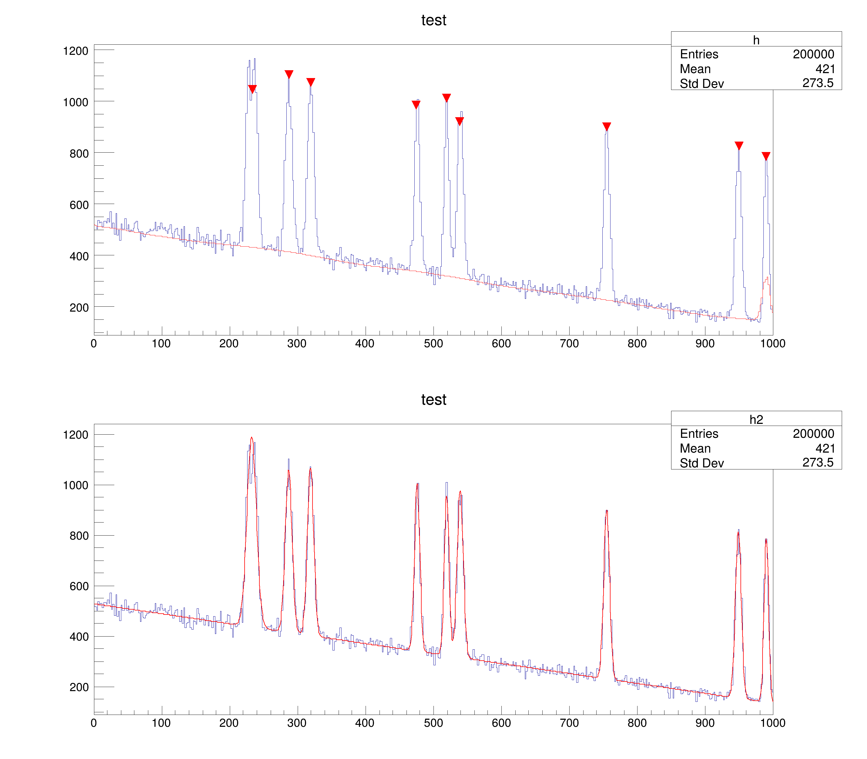 This script generates a random number of gaussian peaks on top of a linear background. The position of the peaks is found via TSpectrum and injected as initial values of parameters to make a global fit. The background is computed and drawn on top of the original histogram.