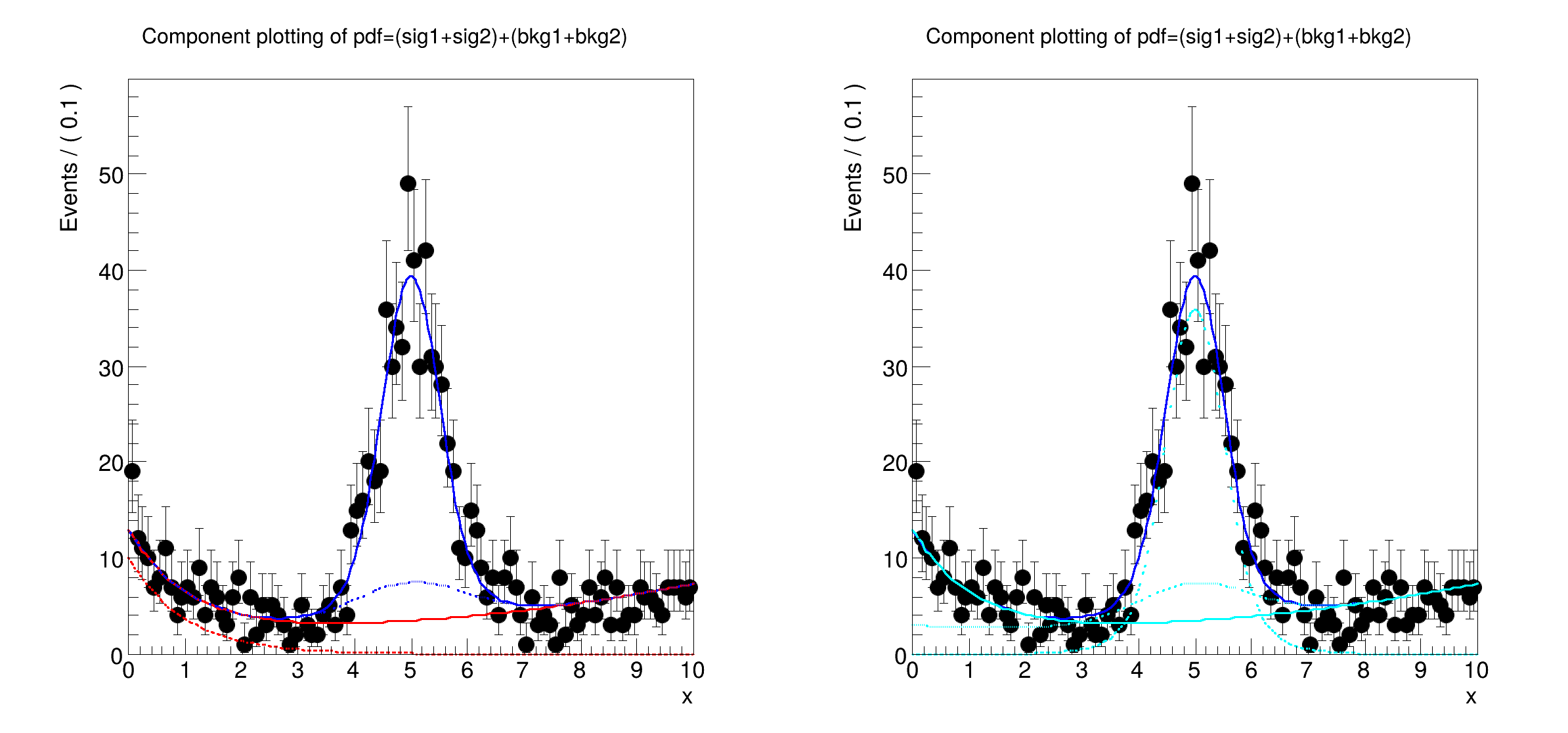 model.plotOn(xframe2, Components("bkg1,sig2"), LineStyle(kDotted), LineColor(kCyan));