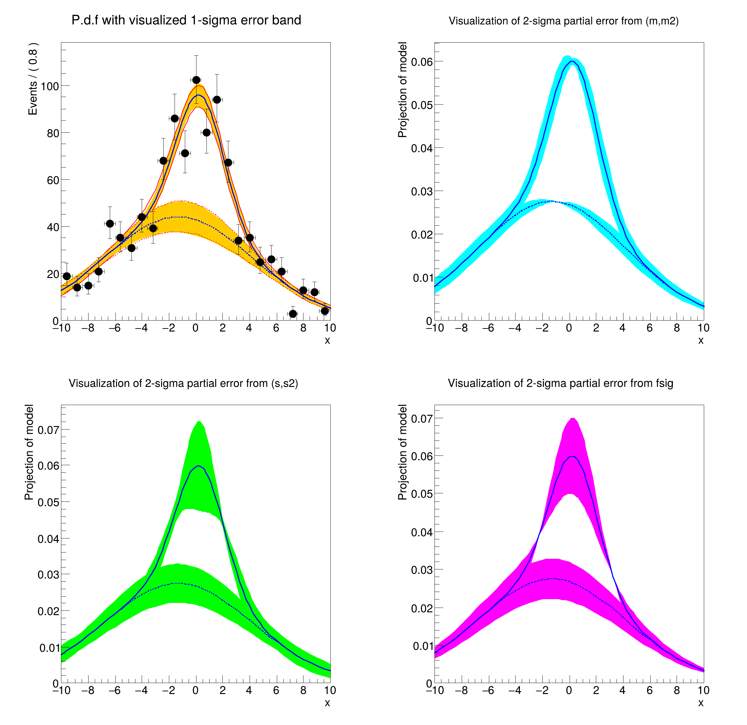 [#1] INFO:Plotting -- RooAbsReal::plotOn(model) INFO: visualizing 1-sigma uncertainties in parameters (m,s,fsig,m2,s2) from fit result fitresult_model_genData using 315 samplings.